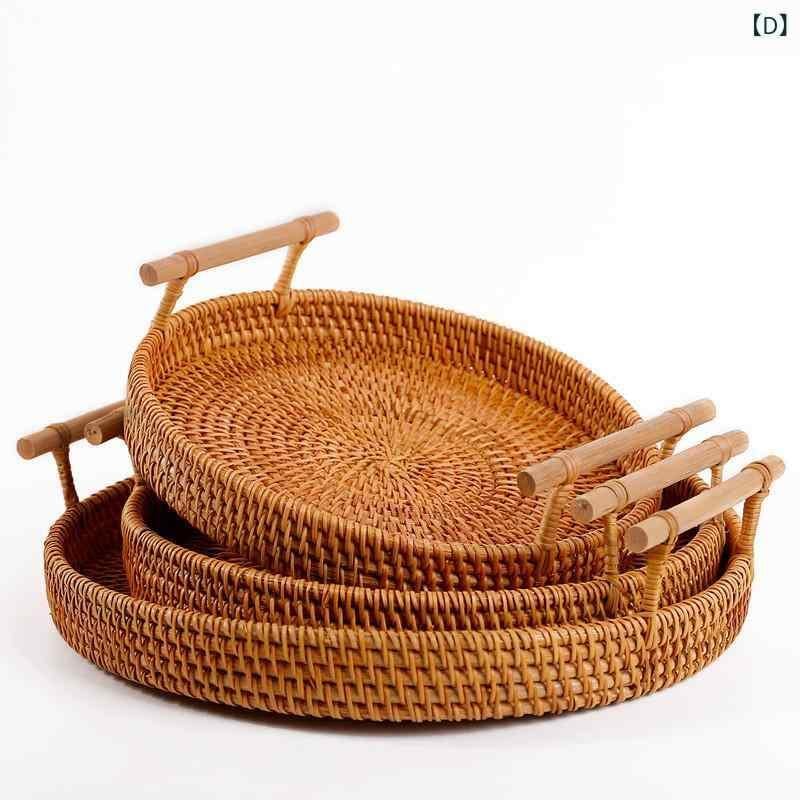 バスケット ラタン製 ベトナム 和風 フルーツかご パンかご リビング収納 食卓 多目的 竹編み バンブー トレイ お盆 円形 取っ手付き 3点セット