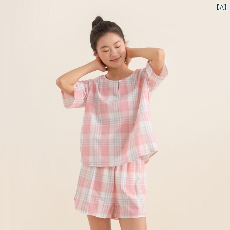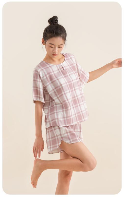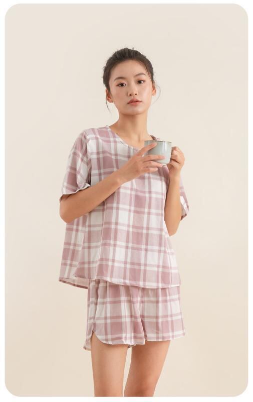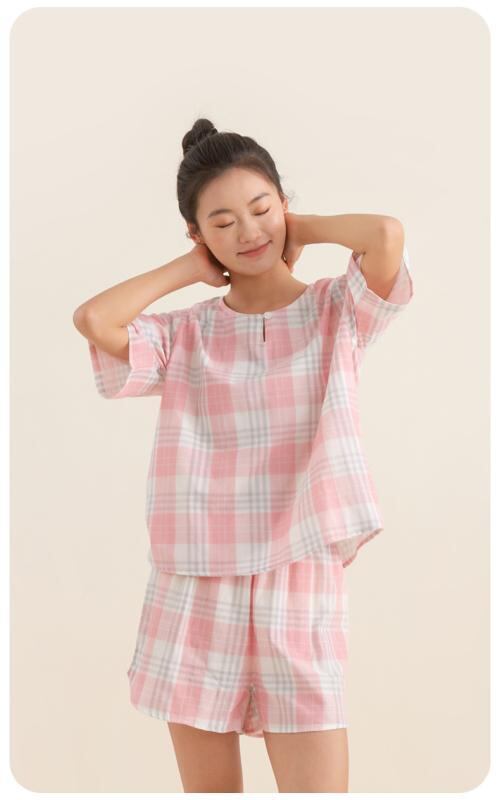 ・カテゴリ: パジャマ ・素材: 綿100% ・スタイル: セットアップ ・厚さ: 普通 ・ネックライン: ノーカラー ・パンツ丈: ショート ・対象: レディース ・適用シーン: 部屋着 ・カラー展開: ピンクチェック、パープルチェック、パープルピンクチェック、ブルーチェック、グレーチェック、ピンクレッドチェック ・サイズ展開: M-L、XL-XXL ・テイスト: 日系 ・誤差範囲: 約1~3cm