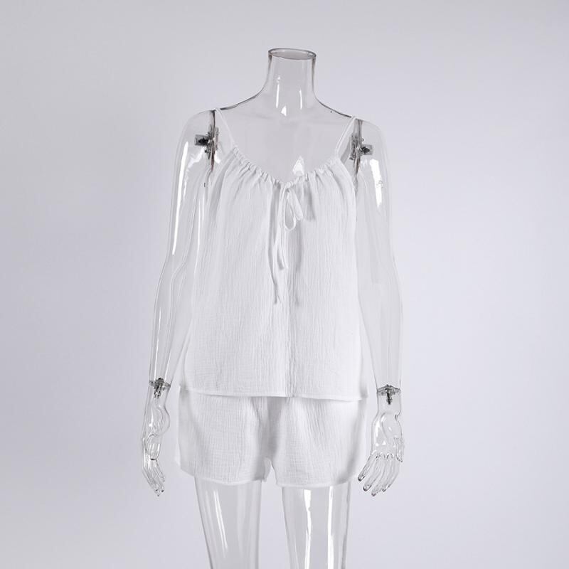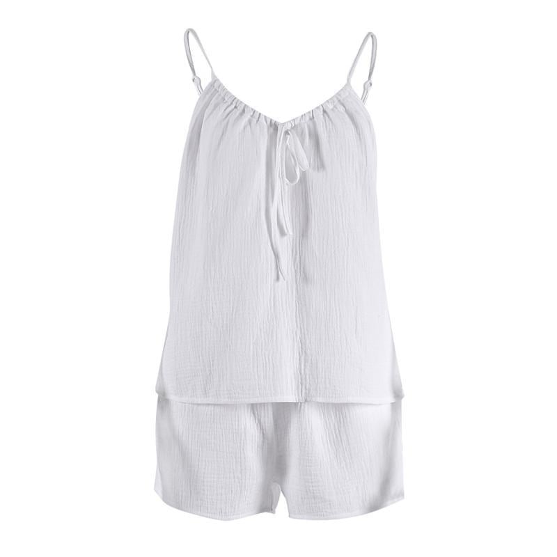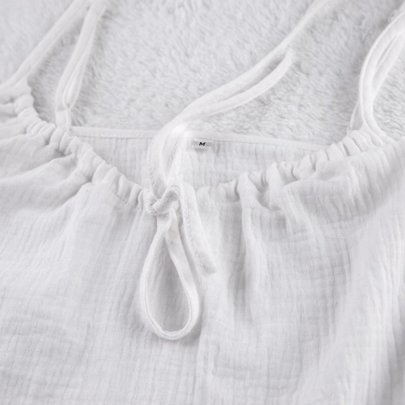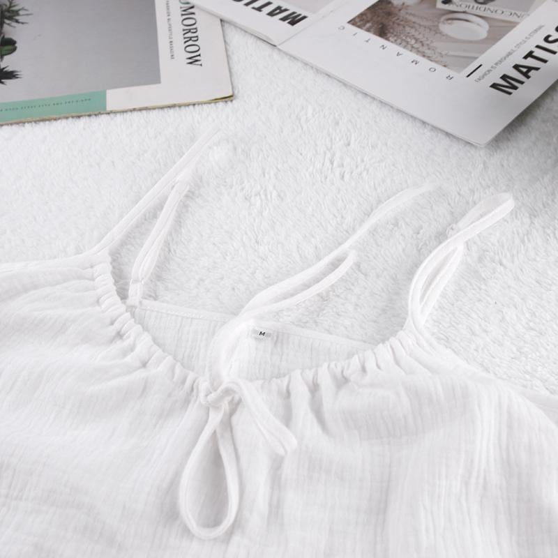 ・カテゴリ: ルームウェアセット・生地: ダブルガーゼ・主な素材: 綿100%・厚さ: 薄手・ネックライン: ノーカラー・袖丈: ノースリーブ・パンツ丈: ショート丈・機能: 授乳、通気性、伸縮性、快適、涼感、部屋着、外出着・着用シーズン: 春、夏、秋、オールシーズン・対象: 若年女性・シーン: アウトドア、自宅、ホテル、スパ・カラー展開: ホワイト、ピンク、ブルー・サイズ展開: S、M、L・スタイル: 欧米風