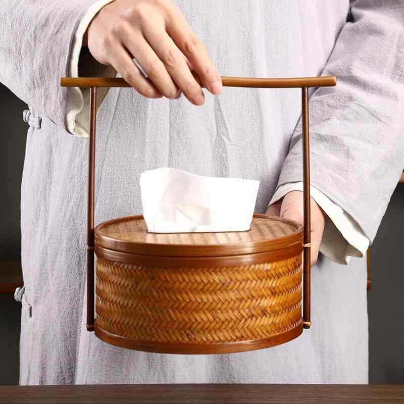 ティッシュケース ボックスティッシュ 竹編み 竹製 漆塗り レトロ 新中式 和モダン 持ち手付き 籠型 バスケット 家庭用 リビング 置物 茶道具 インテリア雑貨 撥水加工