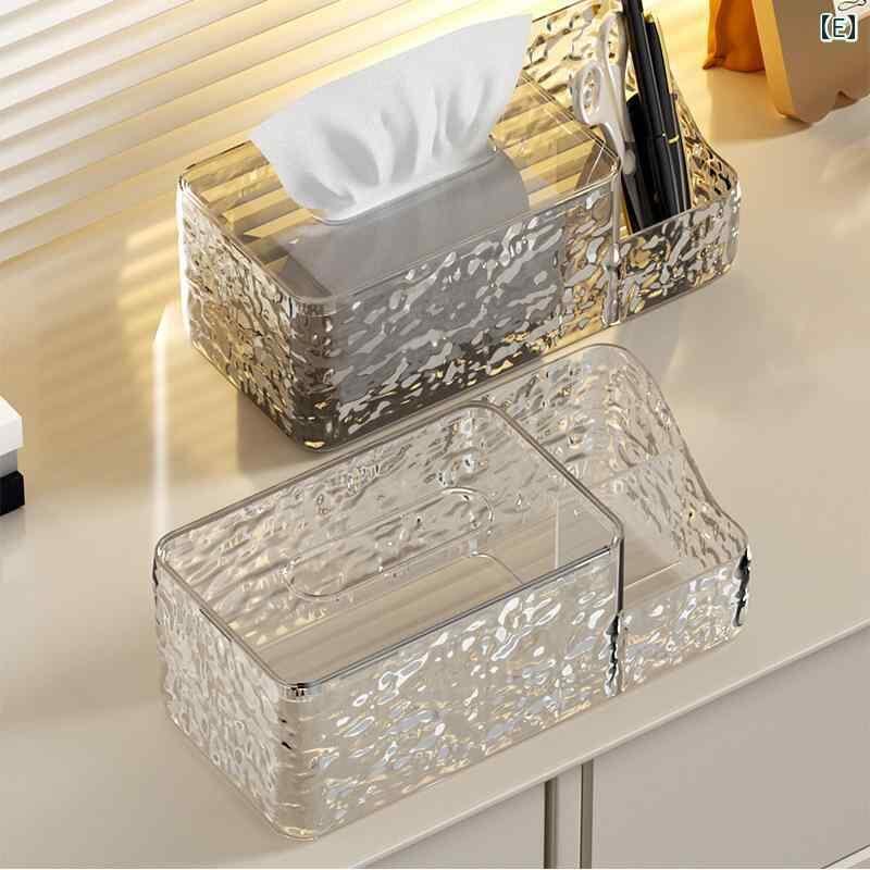 ティッシュケース 氷河模様 ウェーブデザイン 多機能 リモコンスタンド 小物入れ リビング 卓上 家庭用 おしゃれ スタイリッシュ 高級感 アクリル調 クリア スモークグレー