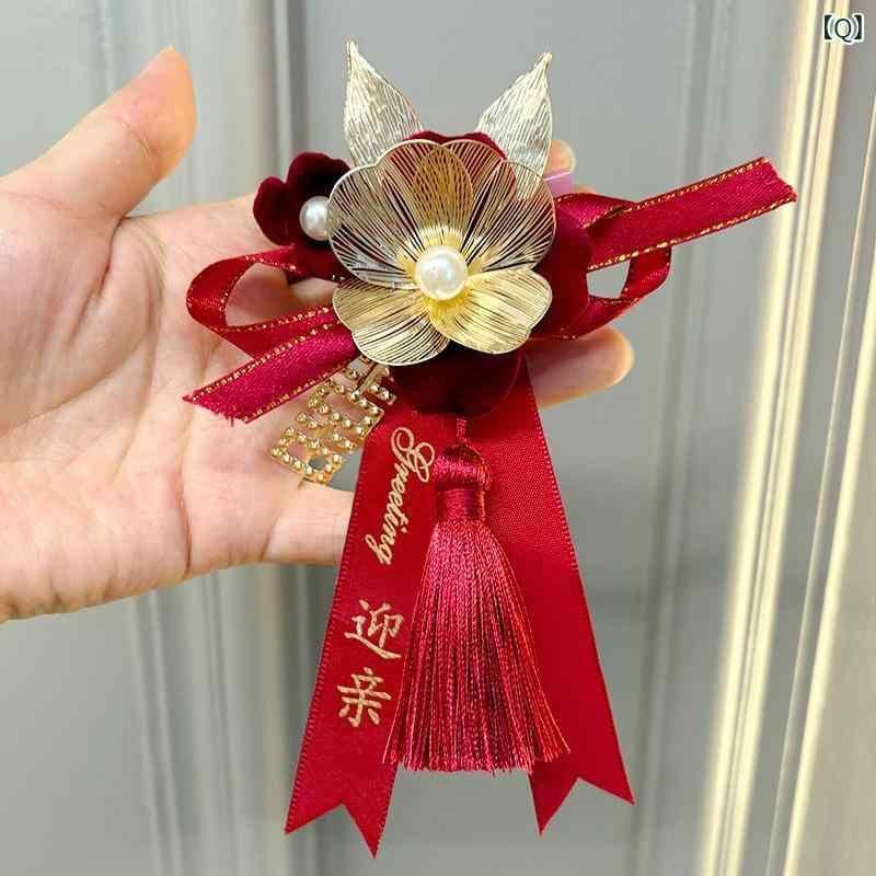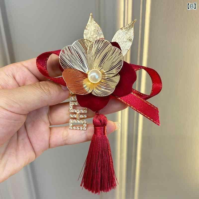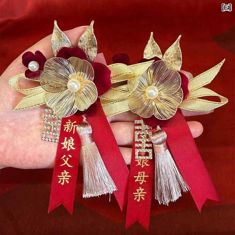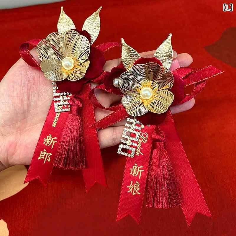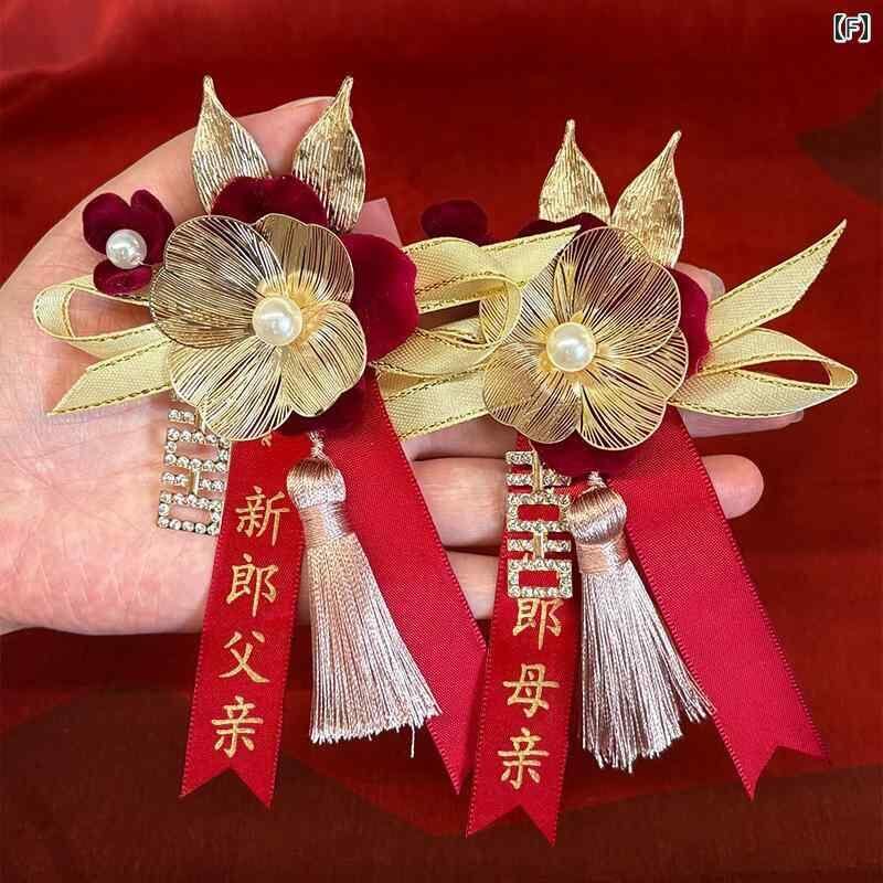 コサージュ ブローチ 高級感 ベルベット 花びら ローズゴールド 合金製 結婚式 ウェディング 新郎新婦 親族 家族 手作り シャンパン ワインレッド