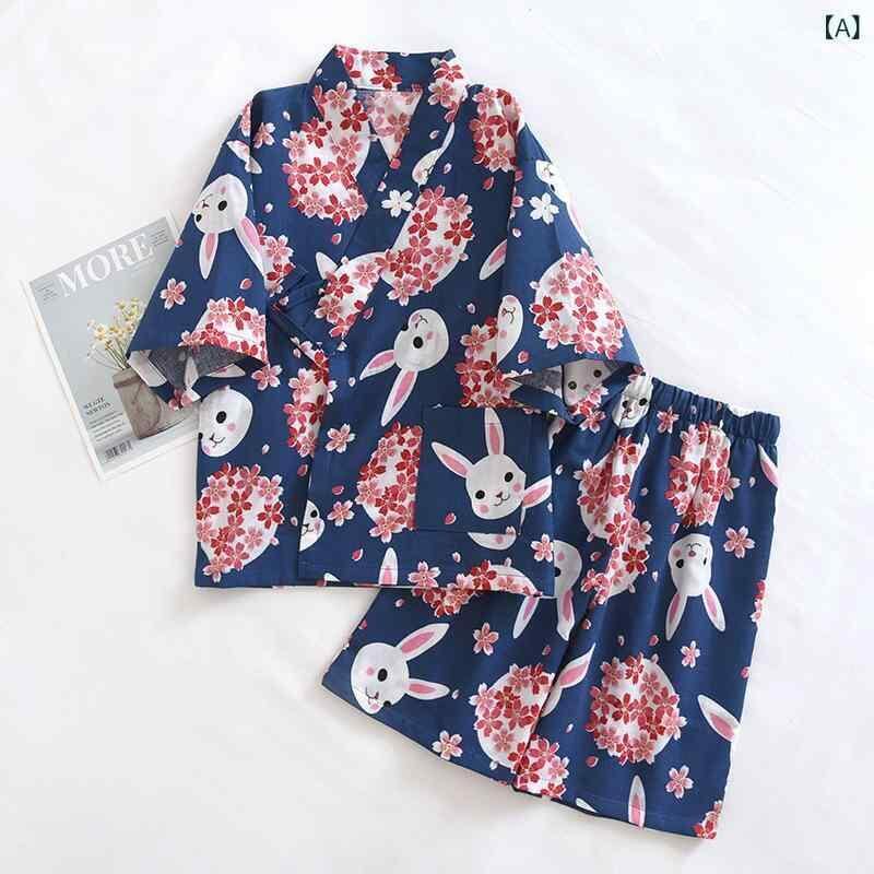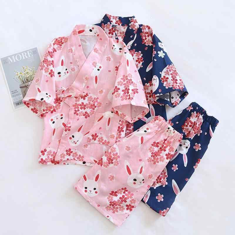パジャマ キッズ 男の子 女の子 男女兼用 綿100% 二重ガーゼ 薄手 快適 肌触り 和風 浴衣風 うさぎ柄 動物柄 紐付き 半袖 七分袖 ハーフパンツ ルームウェア 寝間着 春 夏 秋