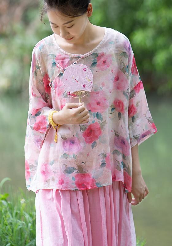 Tシャツ レディース ラミー 麻素材 デジタルプリント クルーネック 七分袖 チャイナボタン ゆったり ルーズフィット エスニック 民族風 レトロモダン カジュアル トップス ピーチカラー