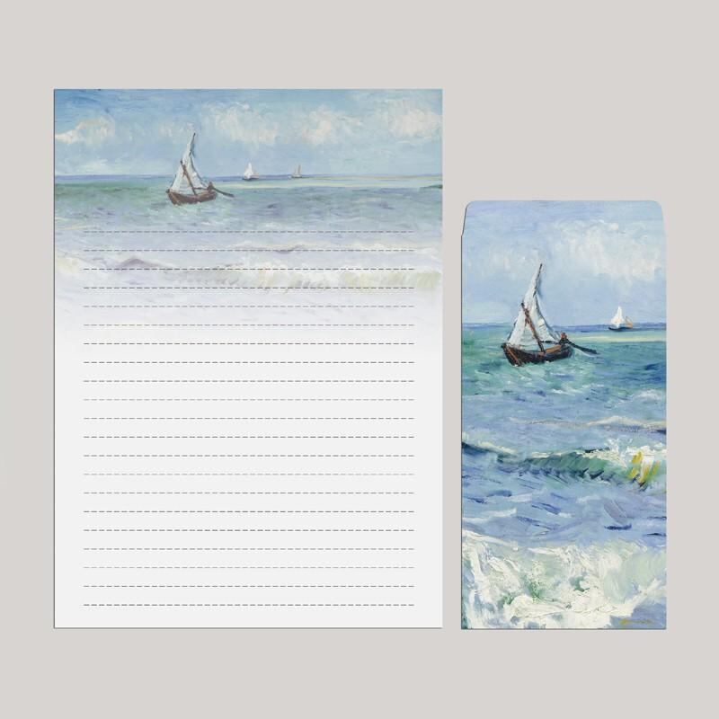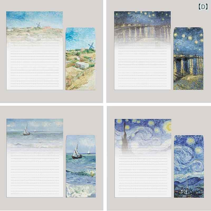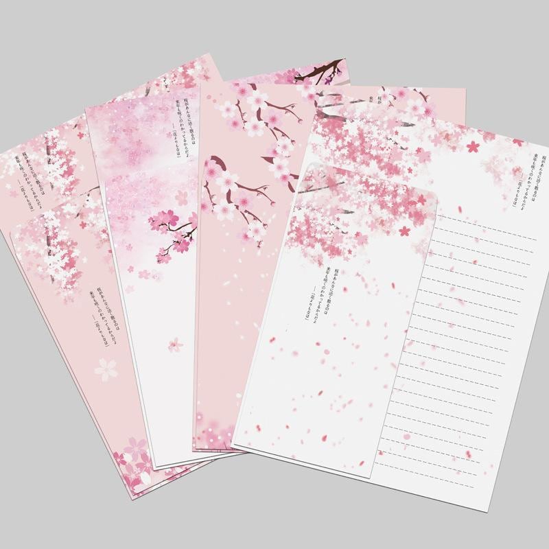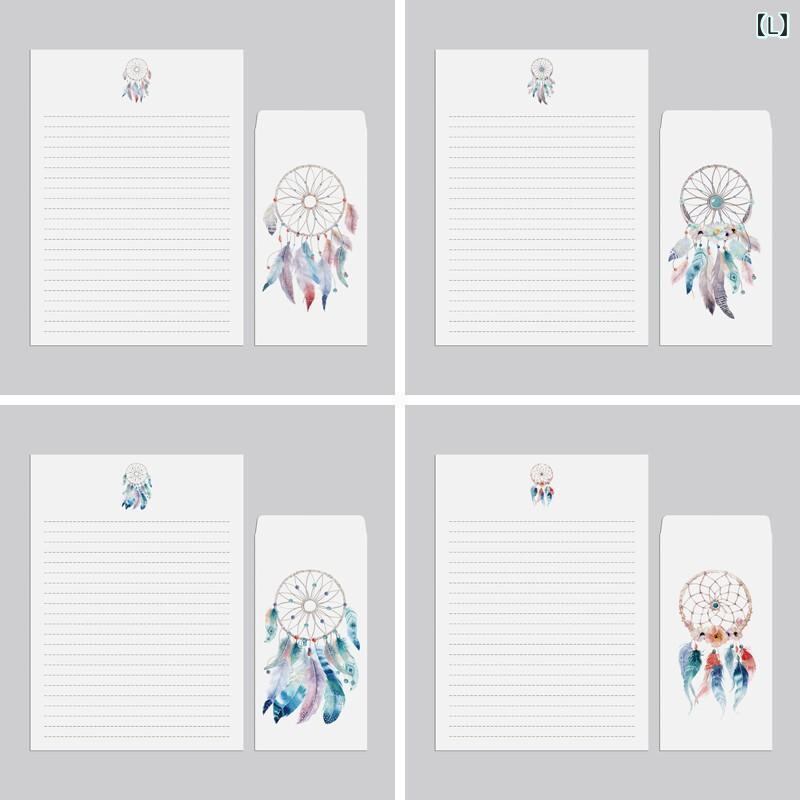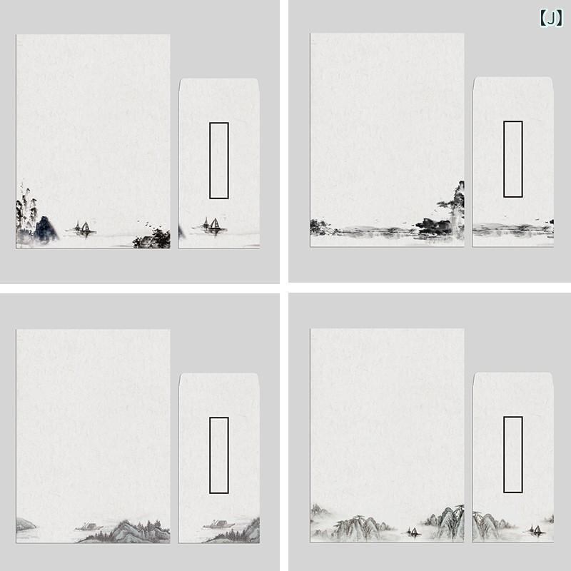・素材: 紙 ・種類: レターセット ・セット内容: 封筒5枚、便箋5枚 ・デザイン展開: 楼閣風景、舞い散る桜、かわいい猫と犬、絵画風景、うさぎ、シンプル動物、八行箋、花景色、かわいい表情、水辺風景、音楽モチーフ、ドリームキャッチャー、ペンギン、手紙風景、ヨーロピアン花柄