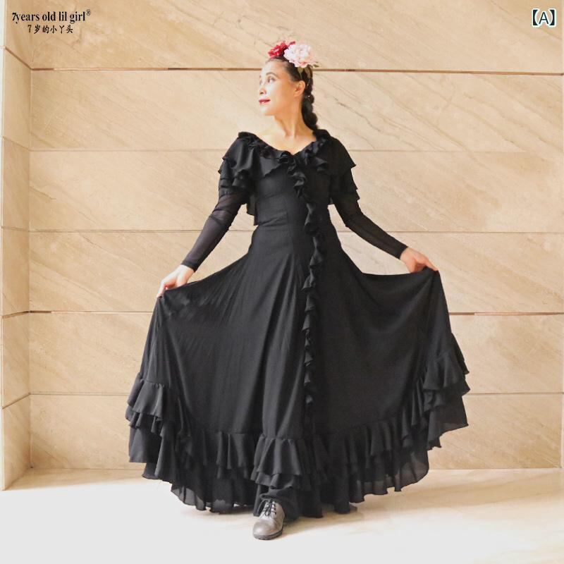 ワンピース レディース スペイン フラメンコ ダンス ドレス 黒 厚手 シフォン ポリエステル 練習 レッスン 発表会 舞台衣装 ステージ衣装 ロング丈 フレア Aライン エレガント