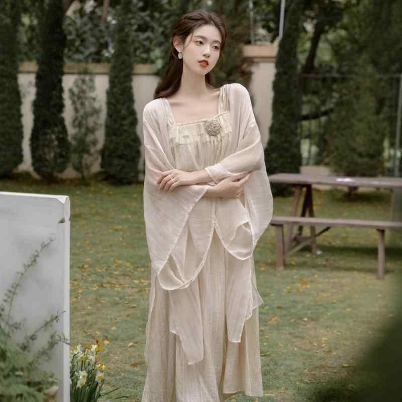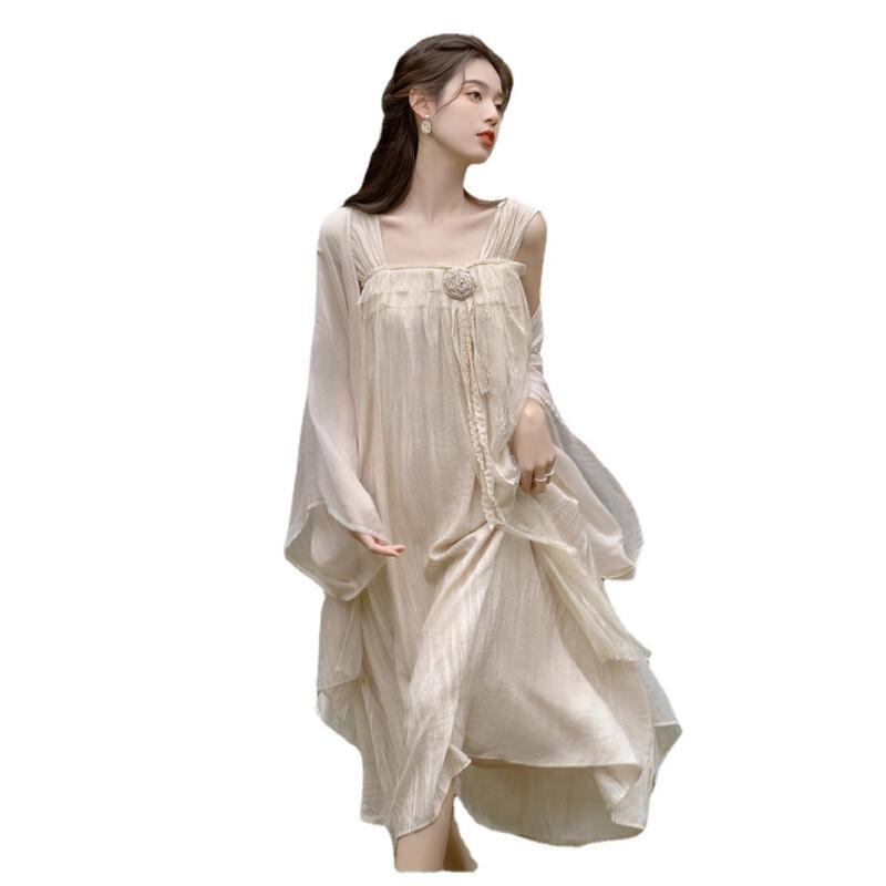 漢服 レディース 新中華風 羽織り カーディガン 齊胸襦裙 ハイウエスト ロング ワンピース ゆったり ルーズフィット フリル 広袖 長袖 シフォン ポリエステル 麻混 レトロモダン エレガント カジュアル 2点セット