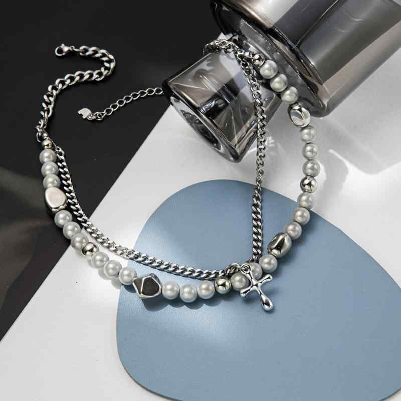 ネックレス ユニセックス 韓国風 ヒップホップ ストリート カジュアル クール シンプル モード系 サージカルステンレス製 二重 重ね付け パール 真珠 ペンダント ロングネックレス 個性的なデザイン 幾何学モチーフ シルバー系