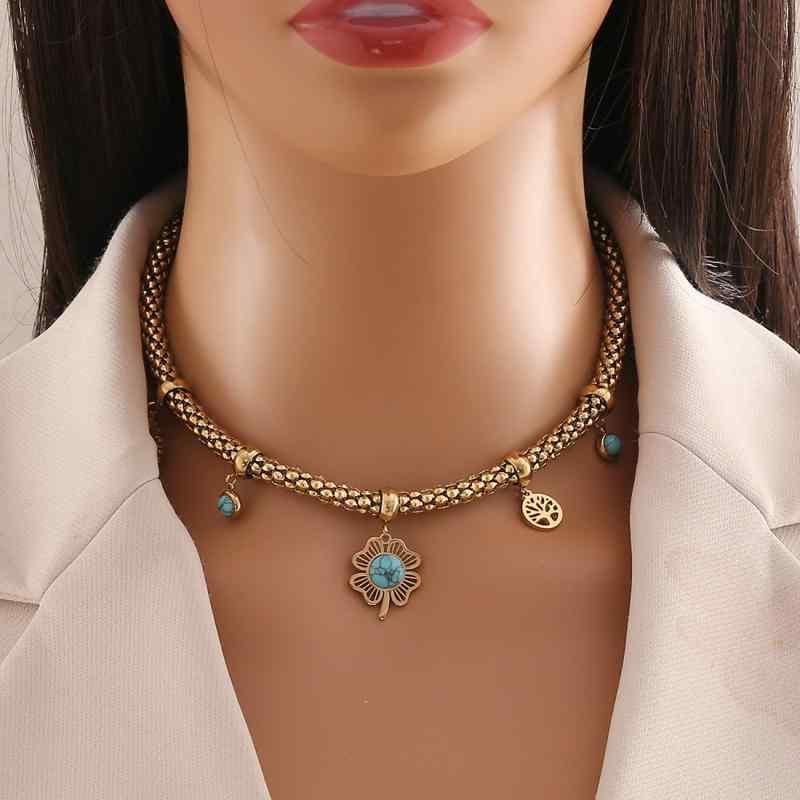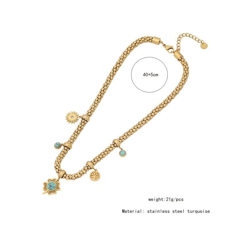 ネックレス レディース ターコイズ 花 フラワーモチーフ ステンレス製 大ぶり 存在感 個性的 欧米風 アクセサリー ポップコーンチェーン 電鍍加工 長さ41cm-50cm