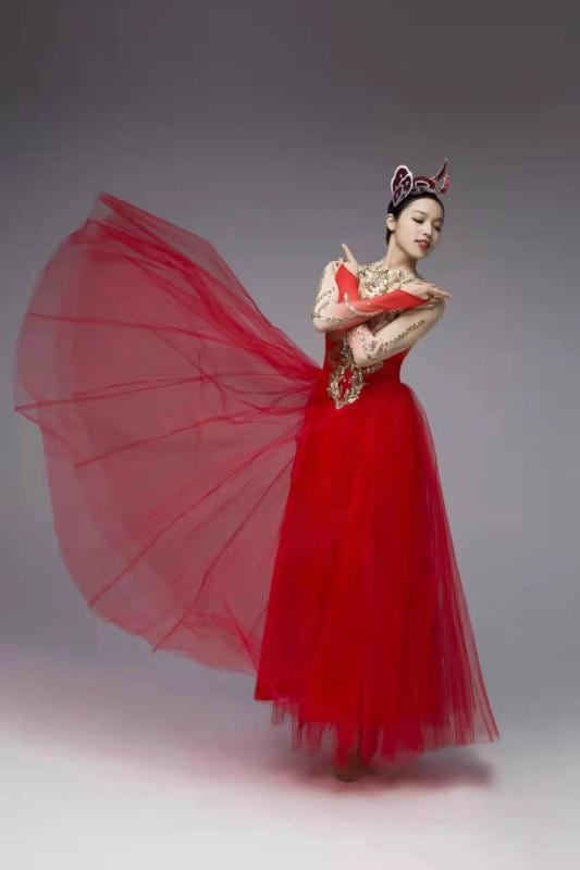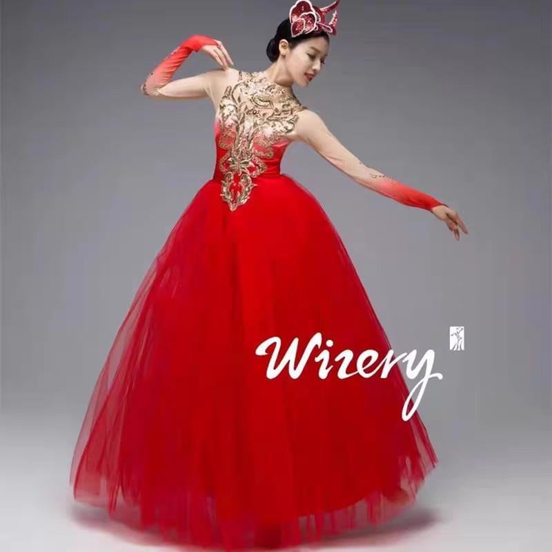 ダンスドレス レディース 女性用 モダン ボリューム フレア 真紅 レッド 赤 スカーレット 開場ダンス 発表会 演奏会 舞台衣装 ステージ パフォーマンス スパンデックス 伸縮性 再生繊維 吉祥 縁起物
