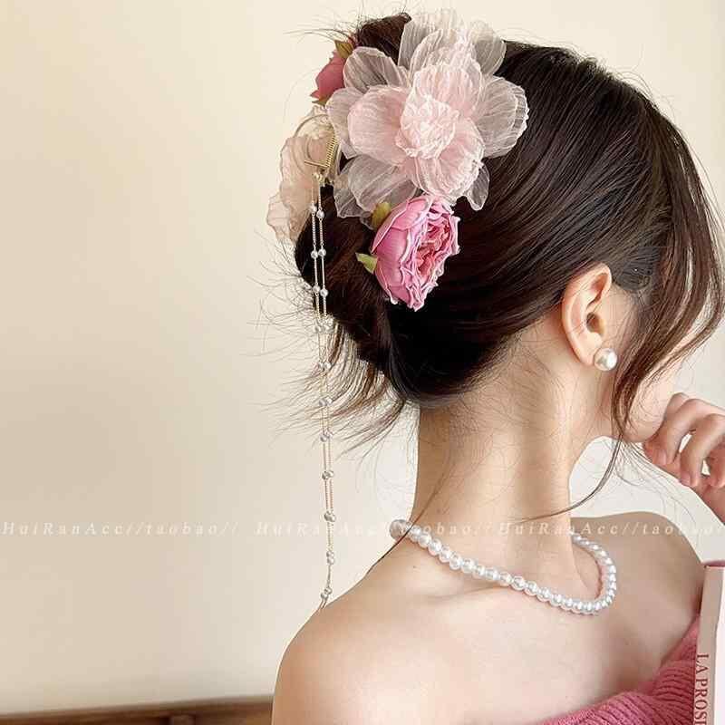 ヘアクリップ レディース フラワー タッセル ビッグサイズ 上品 高級感 まとめ髪 アップヘア デイリーユース 韓国ファッション 布素材 バンスクリップ シャーククリップ 豊富なカラー