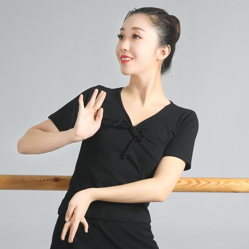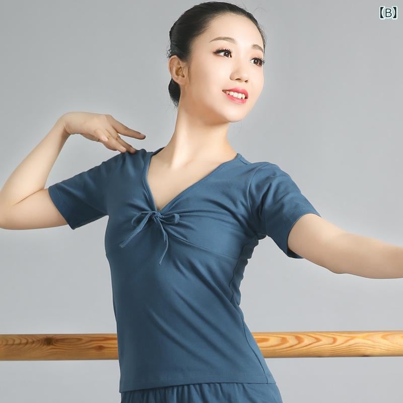 バレエ ダンスウェア レディース Vネック モダール コットン スリムフィット リボン 半袖 トップス 練習着 ヨガ フィットネス 大人用 体操服 ブラック ネイビー 春夏秋 肌触り 快適 ストレッチ