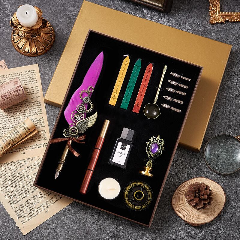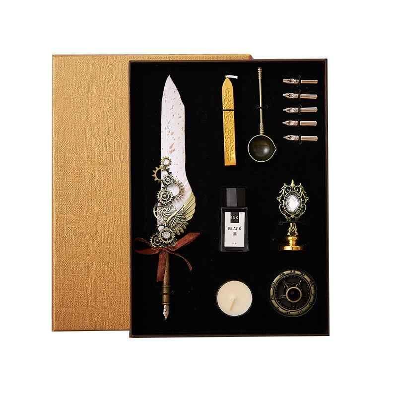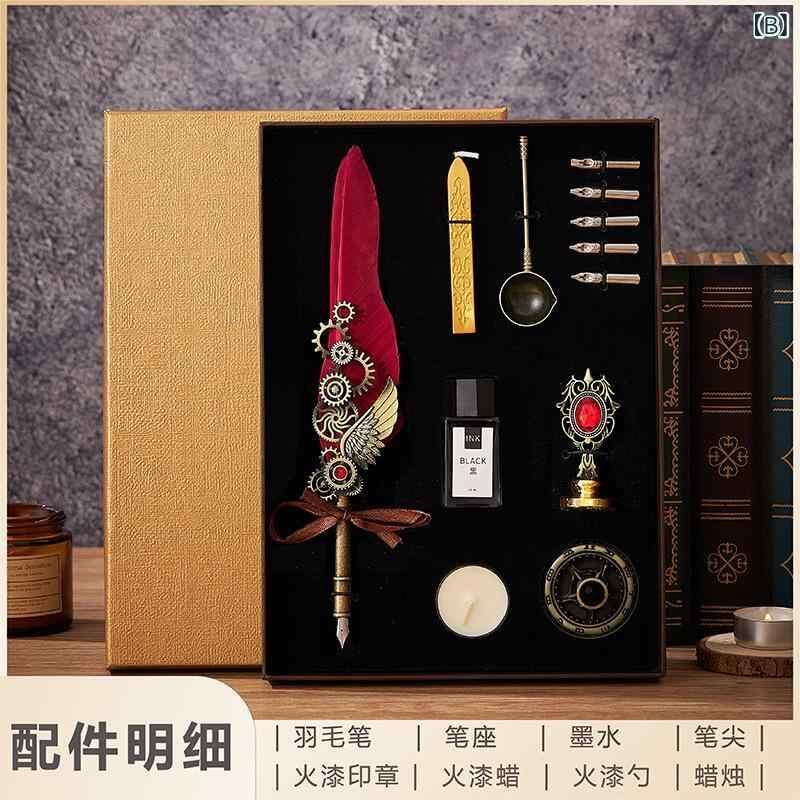 ギフトセット ヨーロピアン アンティーク 羽ペン 万年筆 シーリングワックス スタンプ 封蝋 高級感 エレガント ディップペン メタルペン ステンレス製 豪華ボックス入り 記念日 誕生日 卒業祝い