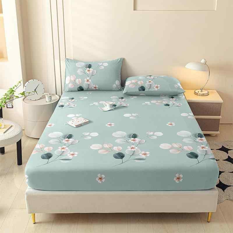 ベッドカバー ウォッシュ加工綿 ボックスシーツ 全周ゴム入り キルティング 活性染料ボタニカル柄プリント 北欧風 寝室用 ホワイト ブラック