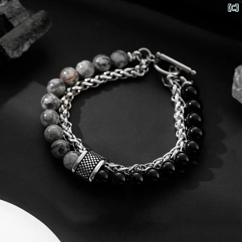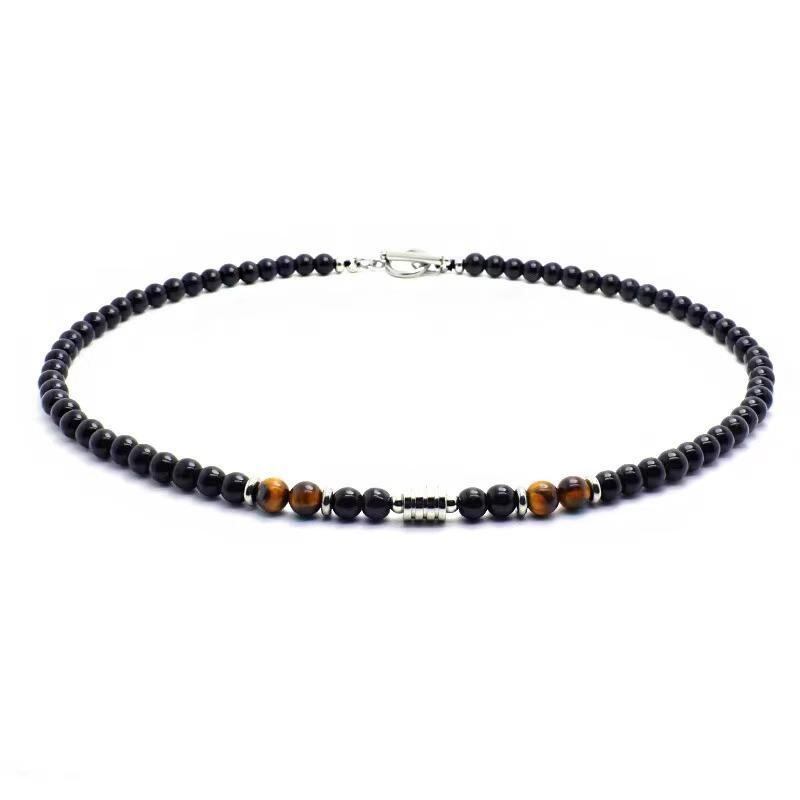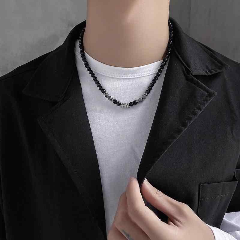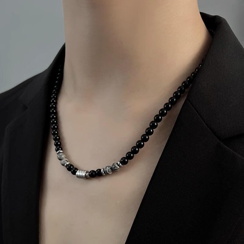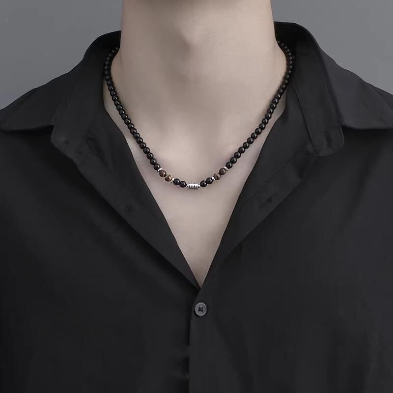 ネックレス メンズ オブシディアン ビーズ ユニークデザイン レトロ ヒップホップ ラッキーアイテム 鎖骨チェーン チタン鋼 幾何学模様 クールスタイル ストリートファッション カジュアル 男性用 首飾り
