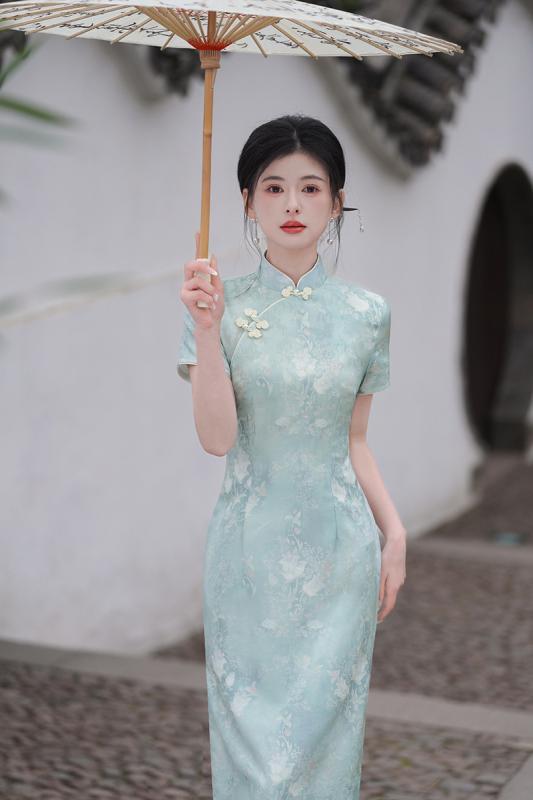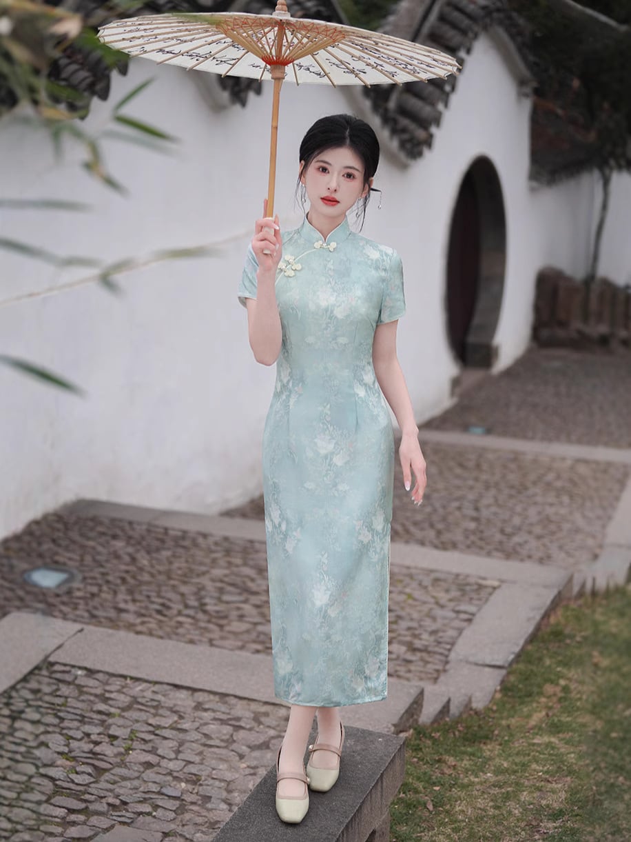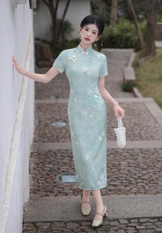 チャイナドレス レディース 改良型 レトロ ロング丈 スリム ハイウエスト エレガント 普段使い 提花織り スタンドカラー 七分袖 斜め襟 微ストレッチ センター スリット 藍色