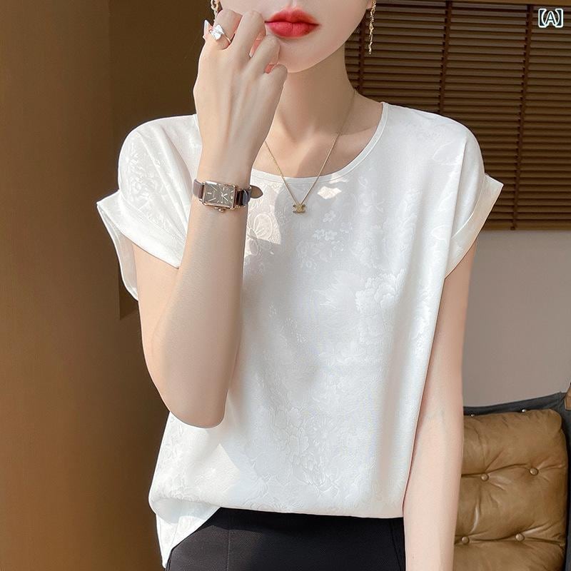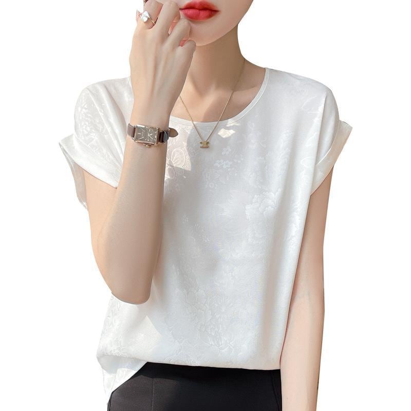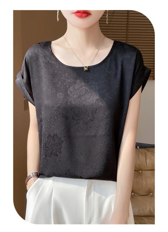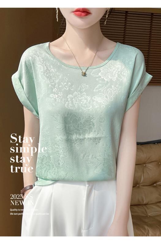 Tシャツ レディース チャイナ風 新中式 サテン ジャガード織り 植物花柄 クルーネック フリル袖 半袖 ゆったり リラックスフィット プルオーバー トップス レトロ エレガント カジュアル