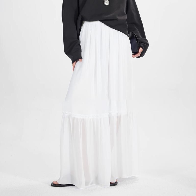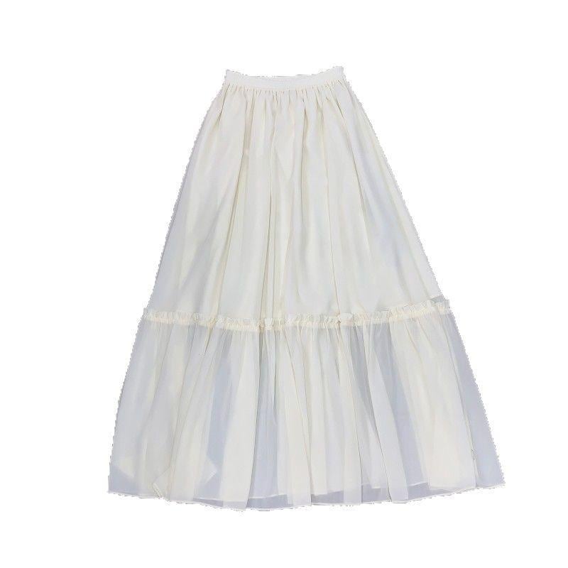 スカート レディース シルク 切り替え チュール メッシュ シアー ロングスカート ウエストゴム Aライン 優雅 軽やか 上品 エレガント フレア フェミニン 無地 クラシックブラック オフホワイト カーキ