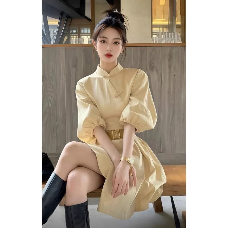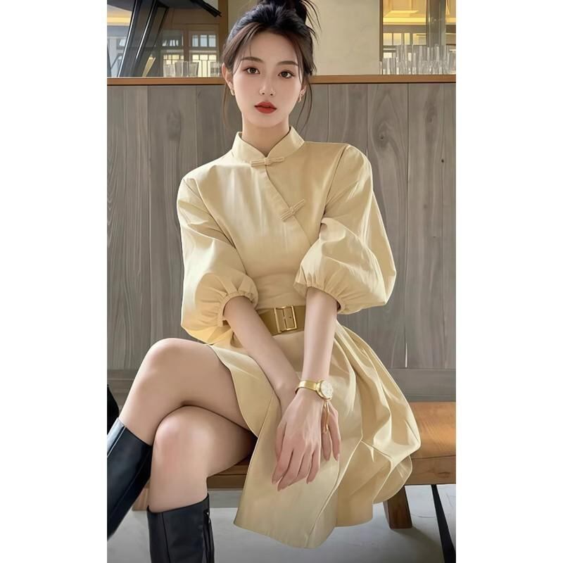 ワンピース レディース 新チャイナ風 立ち襟 シャツワンピース 高級感 エレガント ウエストマーク リボン 長袖 ランタンスリーブ 綿 Aライン ミモレ丈 ロング丈 黄色 無地 カジュアル