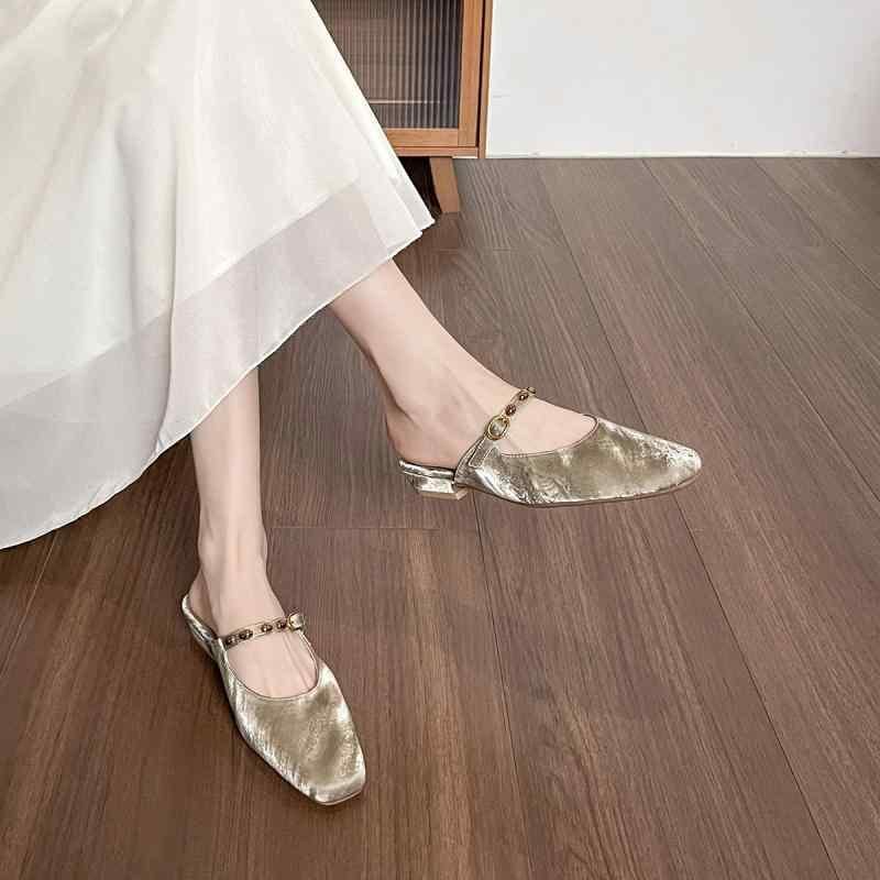 ミュール サンダル レディース つま先あり フラットヒール メリージェーン 高級感 サテン レザー調 外履き デイリーユース 軽量 滑り止め スリッポン スカートコーデ シャンパンカラー