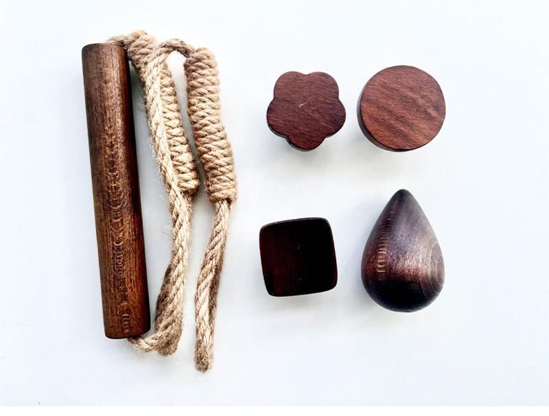 ・種類展開: 麻紐棒通し黒胡桃色丸形、麻紐棒通し黒胡桃色四角形、麻紐棒通し黒胡桃色梅花形、麻紐棒通し黒胡桃色水滴形