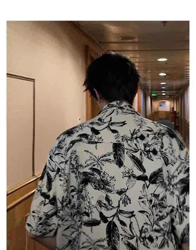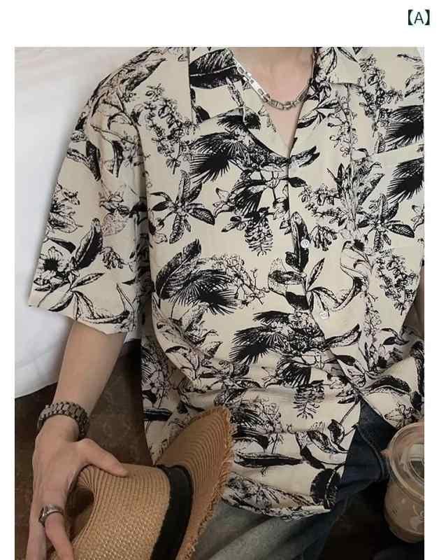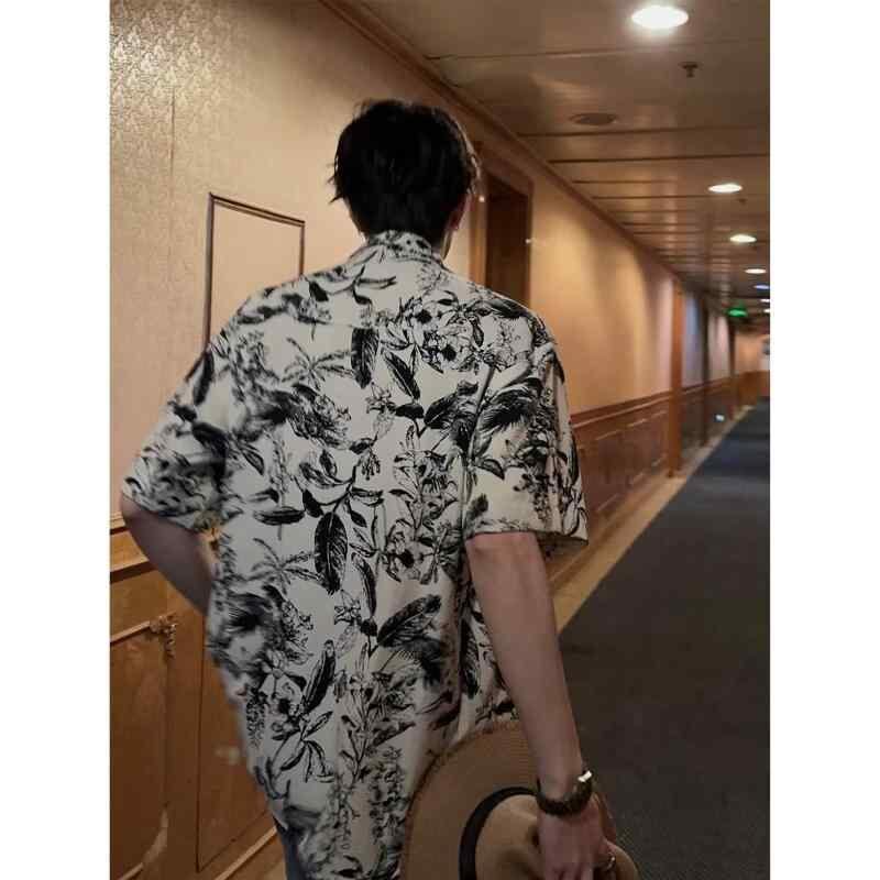シャツ メンズ 半袖 ゆったり 水墨画風 花柄 グラデーション アロハシャツ 竹繊維 ポリエステル オープンカラー 薄手 夏 リゾート ビーチ カジュアルスタイル デイリーユース 胸ポケット アプリコット ベージュ 淡色 クール こなれ感