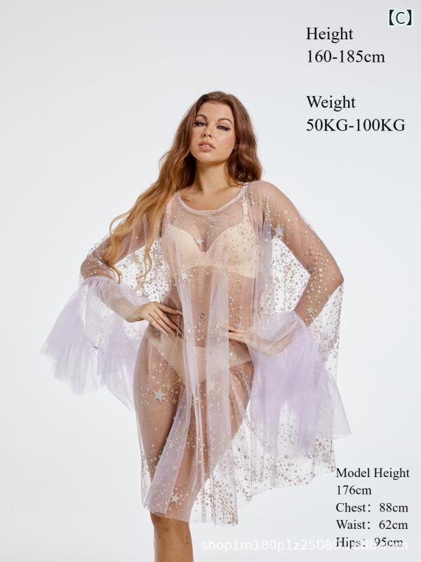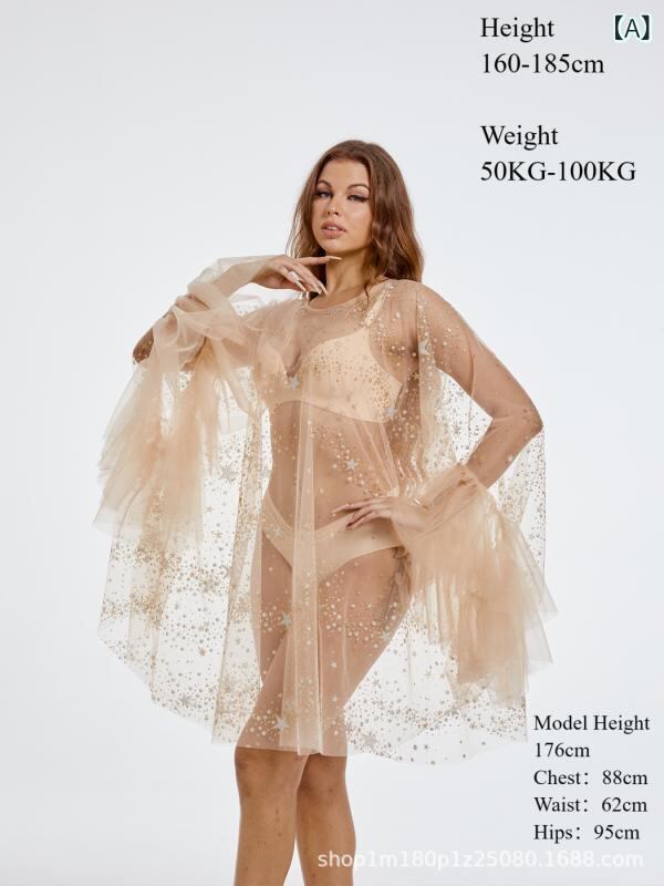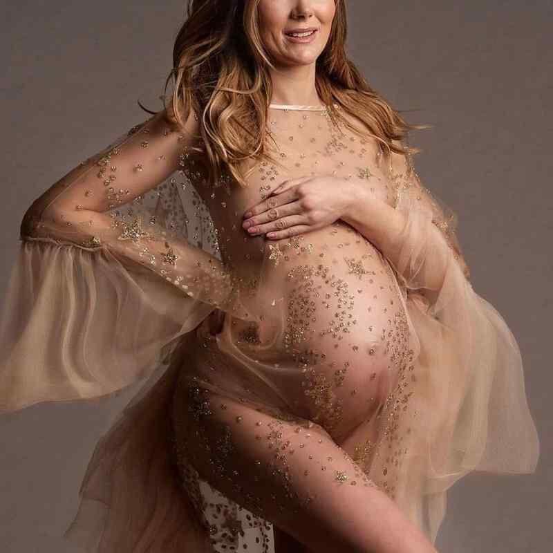 マタニティワンピース セクシー レース マタニティフォト 撮影 ドレス ラウンドネック 七分袖 チュール ポリエステル ドット柄 スパンコール 箔押し アシンメトリー ミニ丈 シャンパンカラー