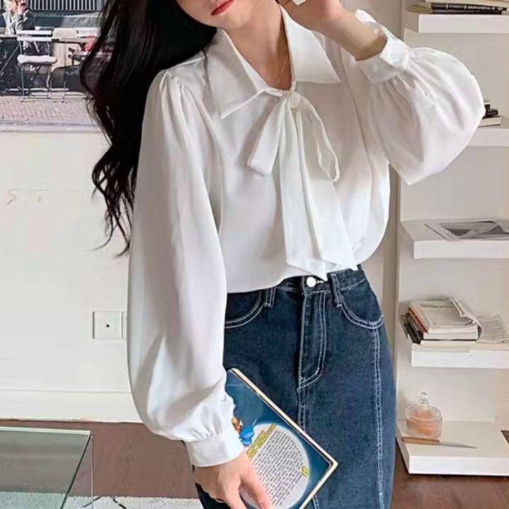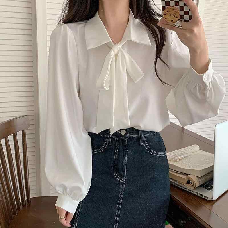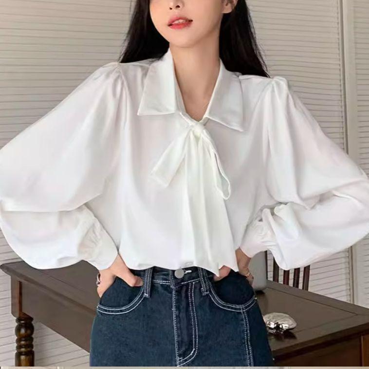 シャツ レディース 白 春秋 フレンチ リボンタイ 長袖ブラウス 綿混素材 無地 襟付き きれいめカジュアル 上品
