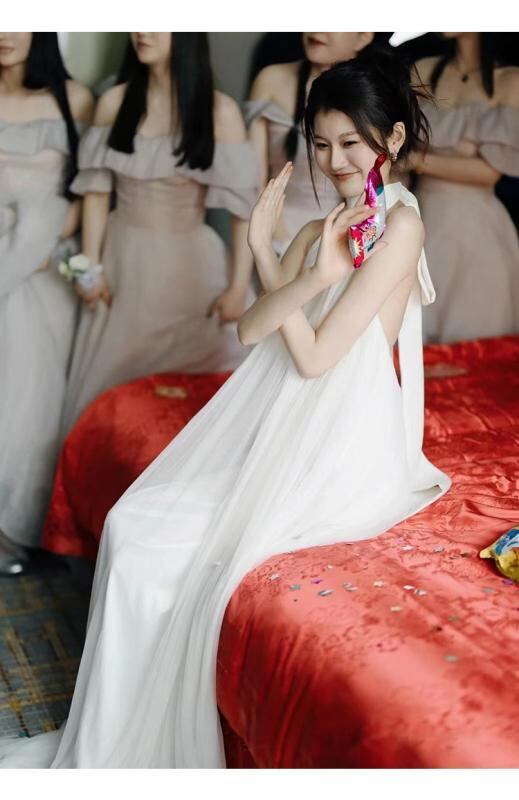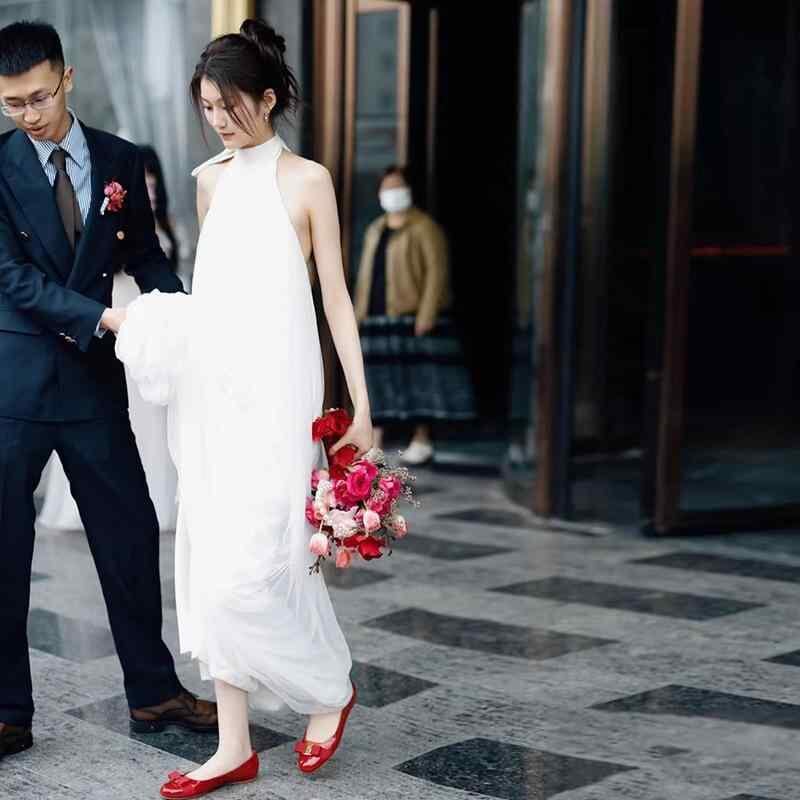 ウェディングドレス レディース ホルターネック シンプル 森ガール風 ロケーション撮影 前撮り 後撮り セルフフォト 花嫁 低身長向け 軽やか 高級感 ポリエステル Aライン ロング丈 ノースリーブ 背中見せ エレガント ホワイト レッド
