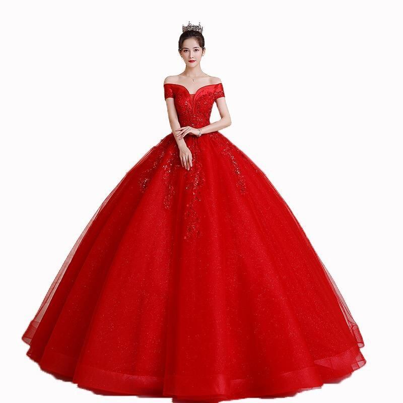 ウェディングドレス レディース オフショルダー 高級感 ボリューム ロング丈 Aラインドレス 赤 レッド 花嫁 披露宴 二次会 お呼ばれ 謝恩会 演奏会 パーティードレス フォーマル ポリエステル