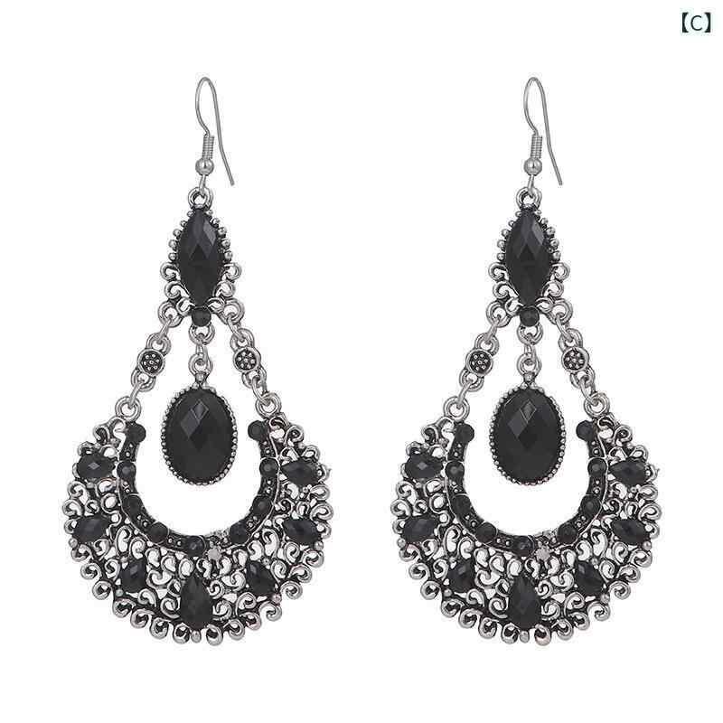 ピアス イヤリング レディース 欧米風 個性的 大人かわいい 上品 フェミニン しずく型 ドロップ 大ぶり 扇型 ファン型 ラインストーン ビジュー キラキラ 高級感 ブラック グリーン レッド ブルー レイクブルー