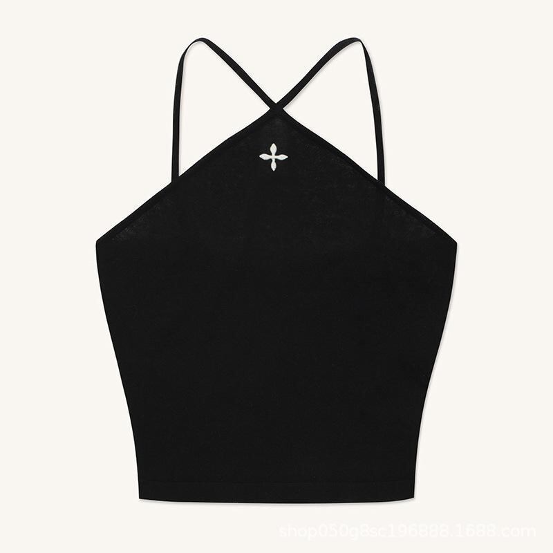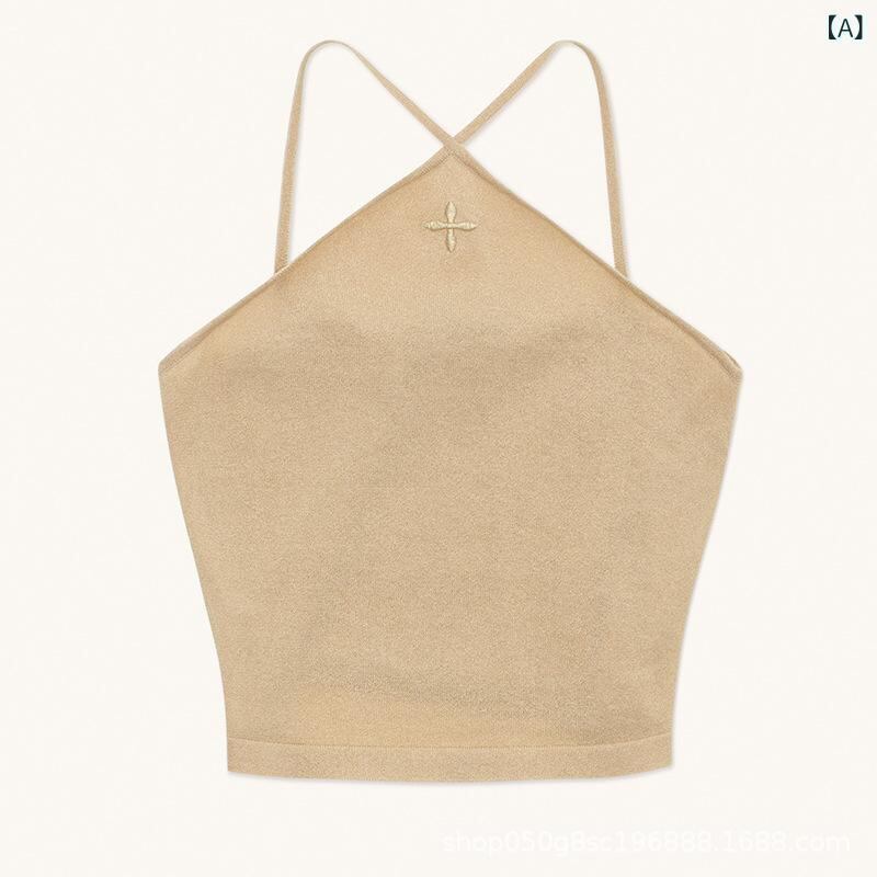 キャミソール レディース ニット 中華風 モダン エキゾチック クロスデザイン ショート丈 ノースリーブ トップス ストリート ロックテイスト ゴールド ブラック