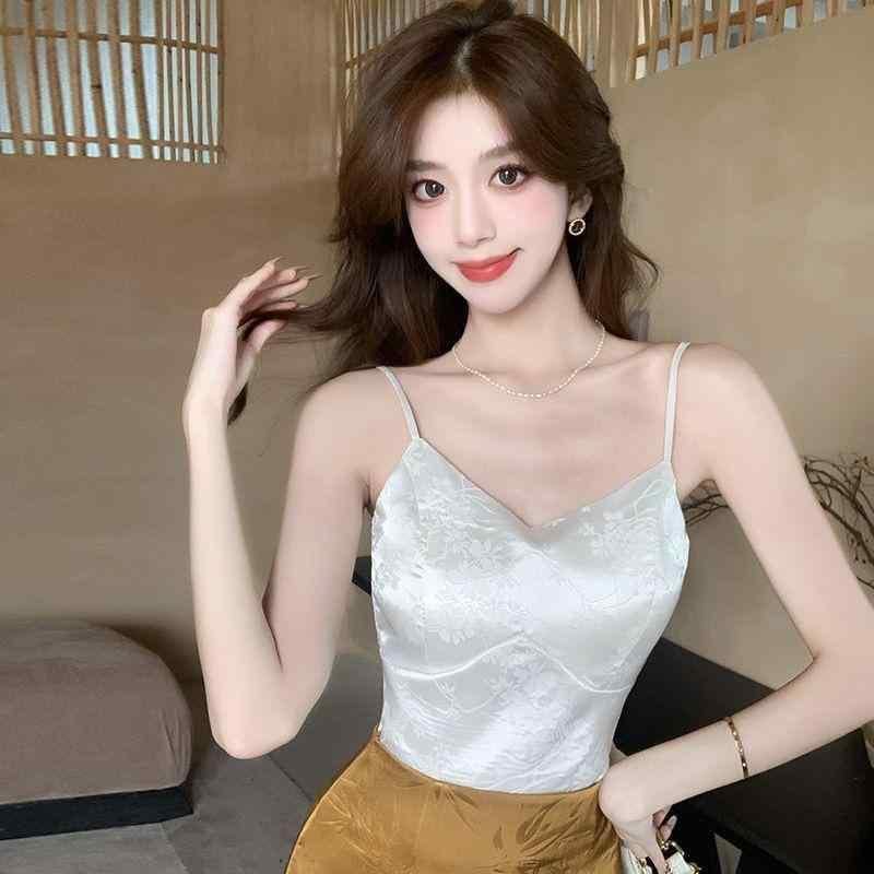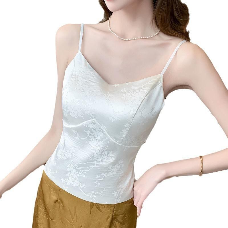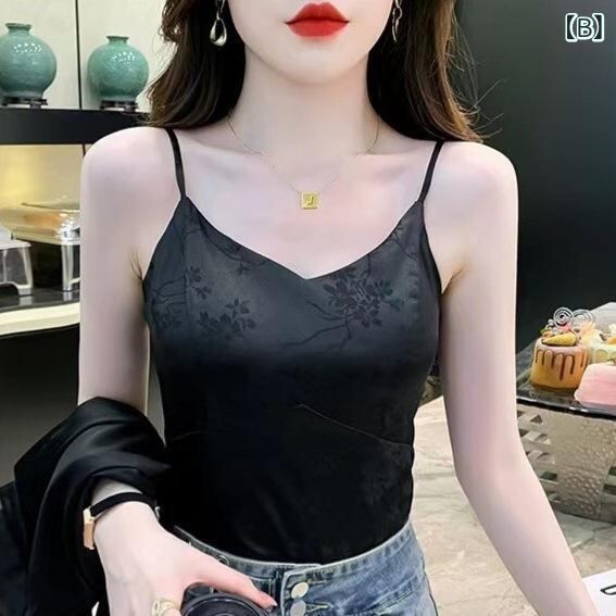 キャミソール レディース 中国風 レトロ ジャガード サテン 花柄 カップ付き インナー トップス スリムフィット エレガント 伸縮性 ナイロン 夏 秋