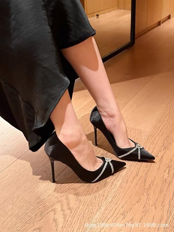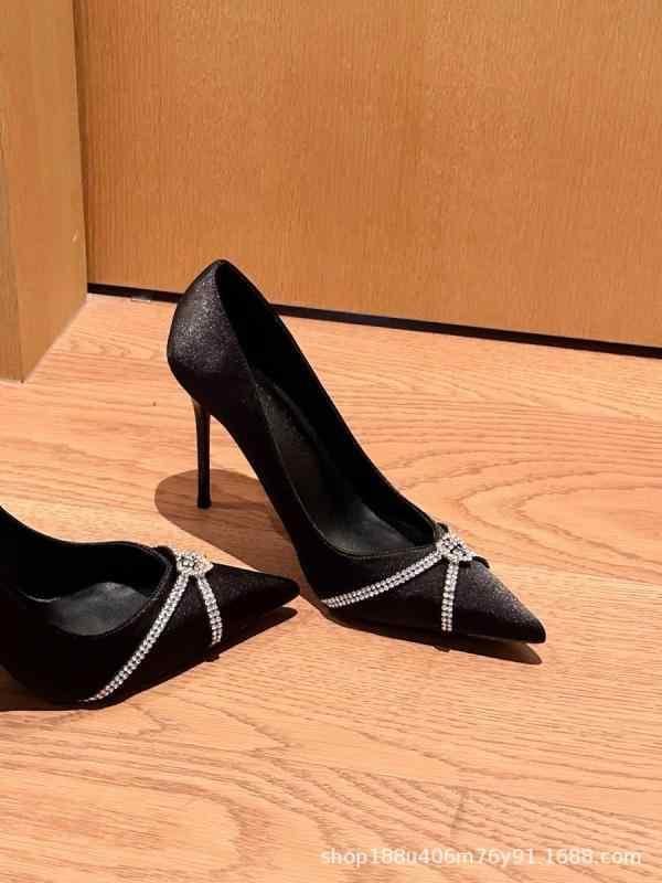 ・カテゴリ: パンプス・スタイル: セクシー・イメージ: エレガント・対象性別: レディース・対象年齢: 大人・アッパー素材: サテン・内側素材: マイクロファイバー・インソール素材: PU・ソール素材: ゴム・柄: 無地・デザイン要素: ラインストーン、浅履き、クロスストラップ・つま先形状: ポインテッドトゥ・ヒール形状: スティレットヒール・ヒール高: 8cm以上・開口部深さ: 約7-11cm・履き口: ローカット・製法: セメント製法・履き方: スリッポン・カラー展開: ブラック・サイズ展開: 33、34、35、36、37、38、39、40