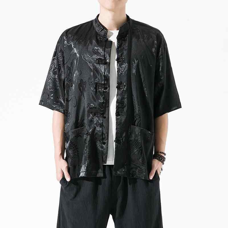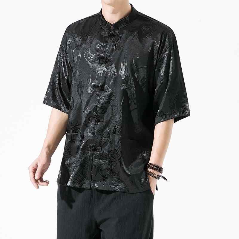シャツ メンズ 半袖 スタンドカラー 中国風 接触冷感 薄手 龍柄 プリント 飾りボタン ゆったり ビッグシルエット ポリエステル混紡 洗濯可能 ノーアイロン 普段使い カジュアル