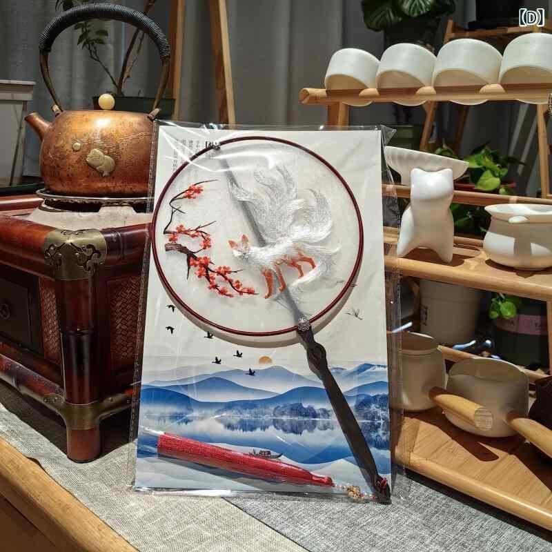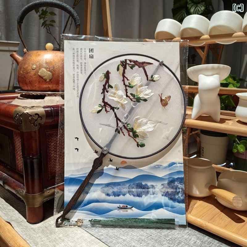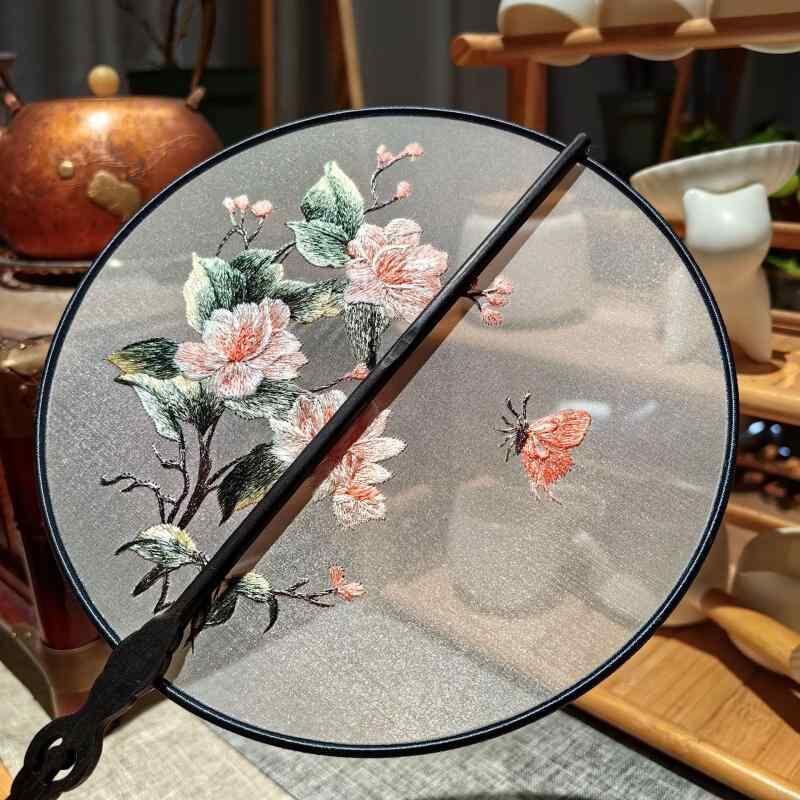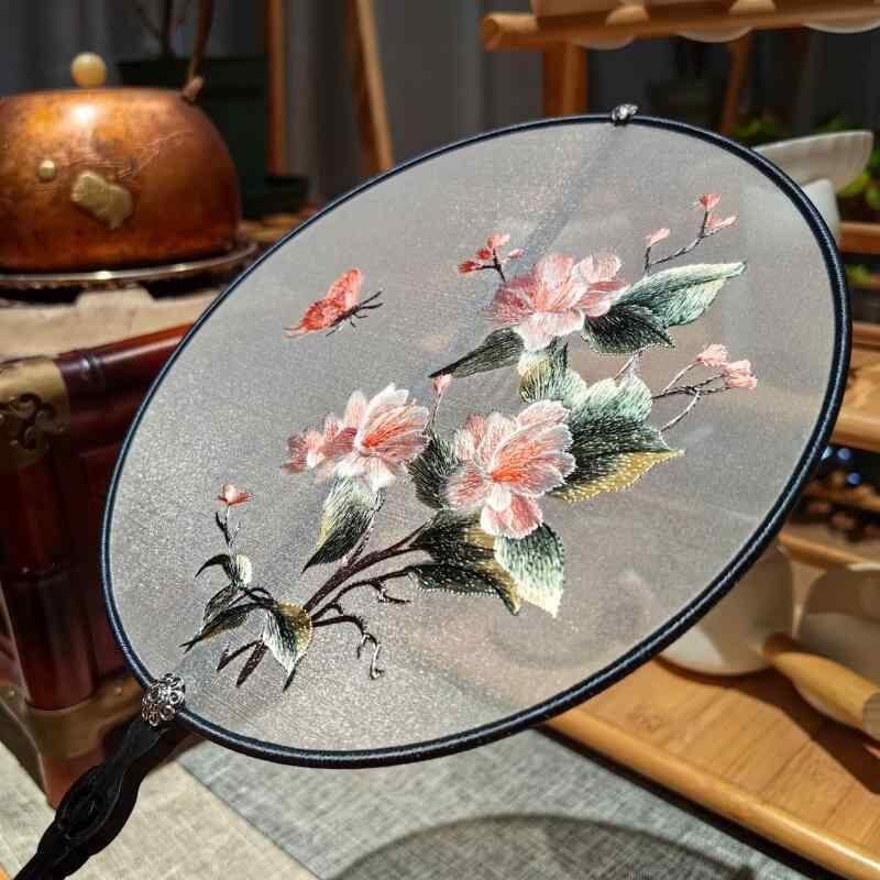 団扇 中国風 伝統工芸品 蘇州刺繍 両面手刺繍 絹布製 木製 紫光檀柄 花鳥風月柄 クラシック 和装小物 観賞用 インテリア 装飾品