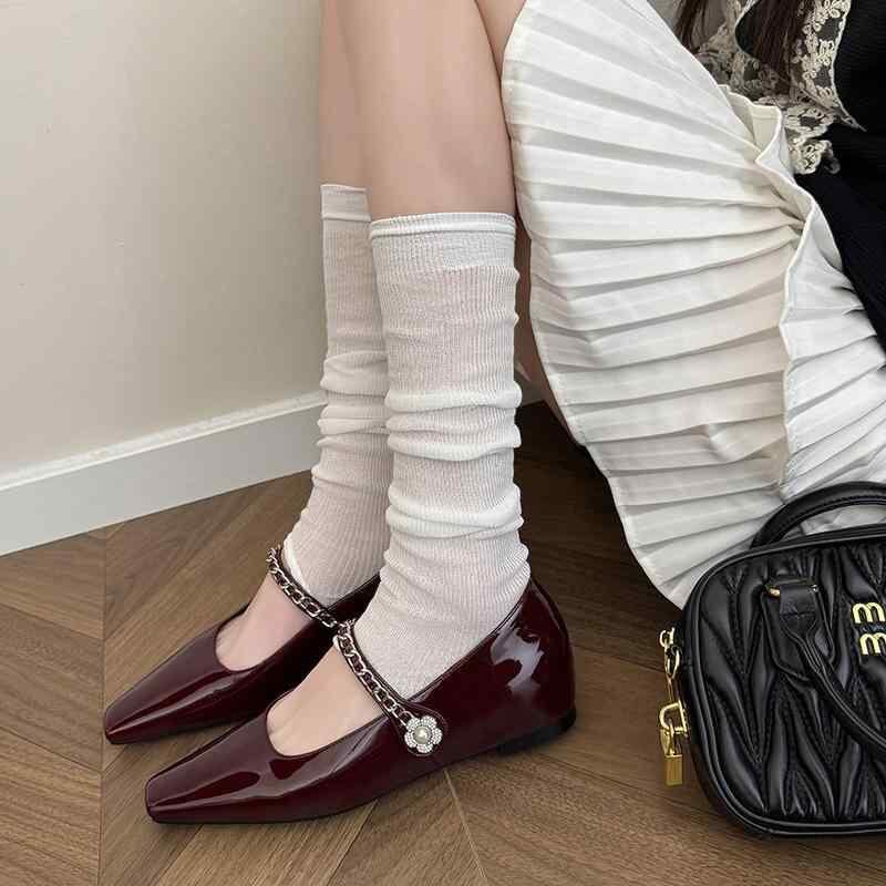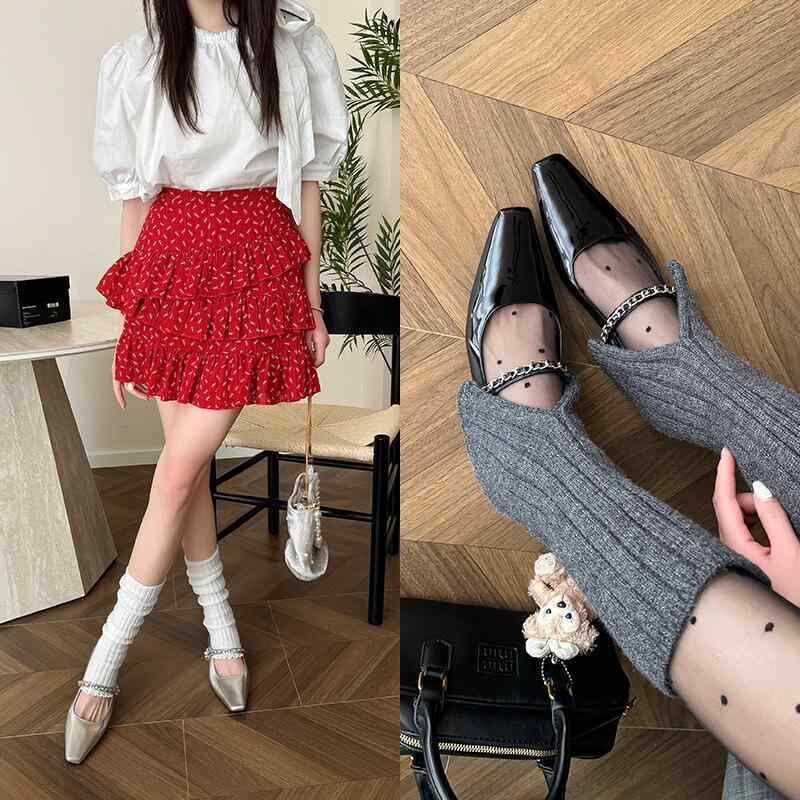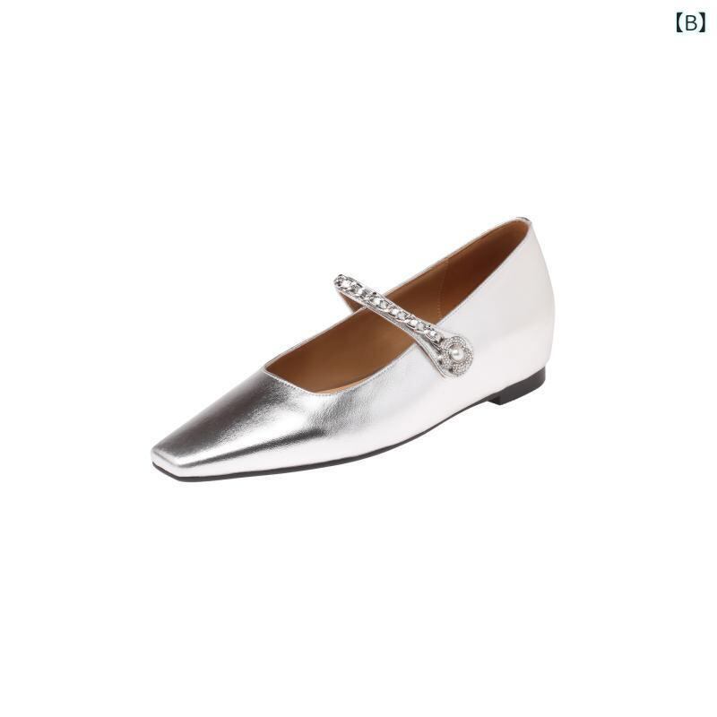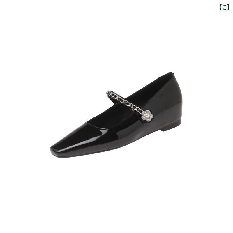 メリージェーン パンプス レディース フレンチデザイン ビジュー花飾り チェーン 牛革 インヒール 太ヒール スクエアトゥ ストラップ 浅め履き口 デイリーユース