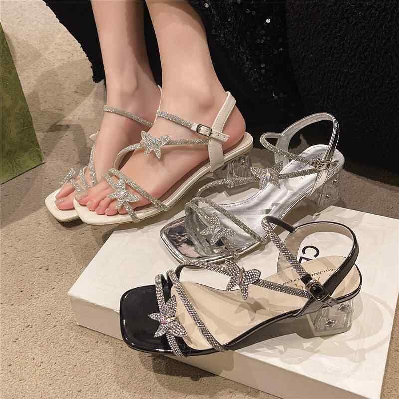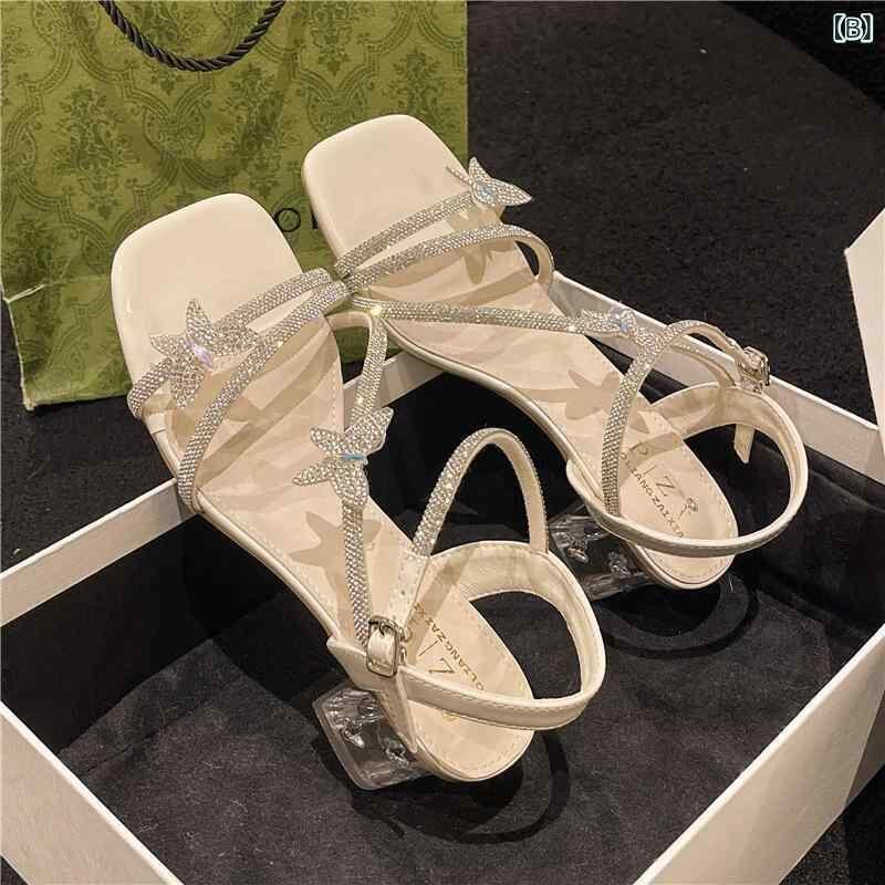 サンダル レディース ラインストーン 蝶々モチーフ ハイヒール ピンヒール スクエアトゥ オープントゥ ワンストラップ アンクルストラップ エレガント セクシー マイクロファイバー素材 パーティー 結婚式 二次会 ブラック ベージュ シルバー