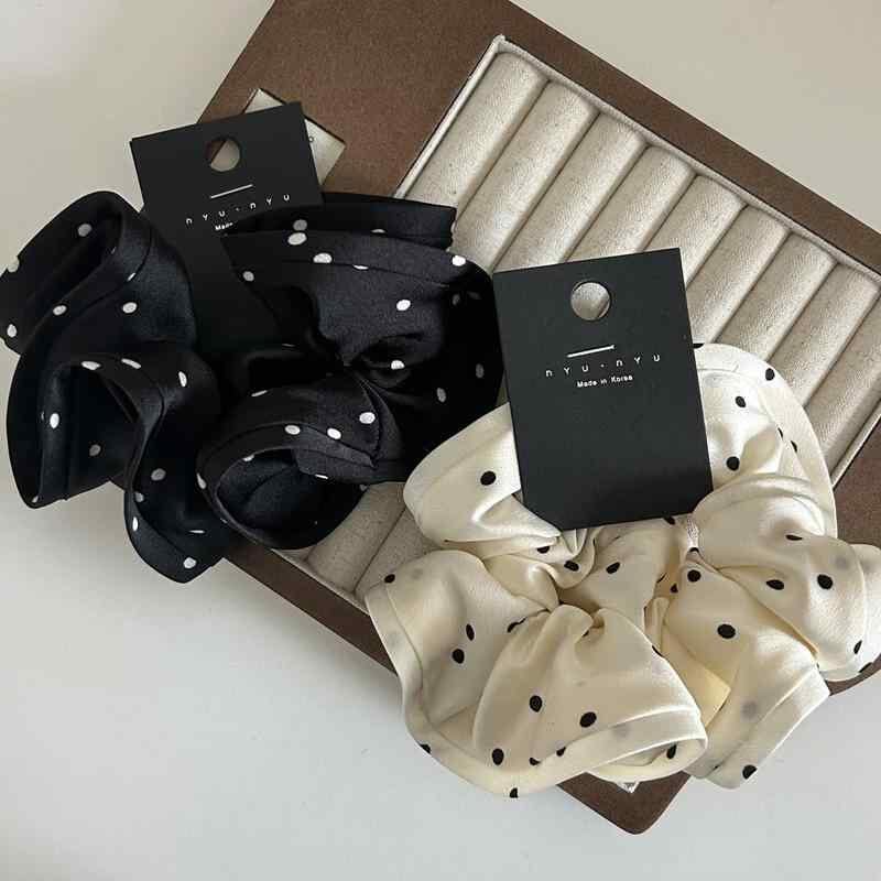 シュシュ 韓国風 エレガント 上品 フリル ドット柄 サテン 花モチーフ 高級感 髪飾り ヘアアクセサリー お団子ヘア まとめ髪 布製 高伸縮性 通勤 オフィス カジュアル 普段使い ブラック アイボリー