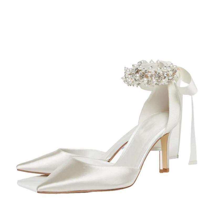 ハイヒール レディース 高級感 サテン調 ポインテッドトゥ リボン アンクルストラップ 細ヒール パンプス 女性用 フォーマル エレガント PUレザー ホワイト 結婚式 二次会
