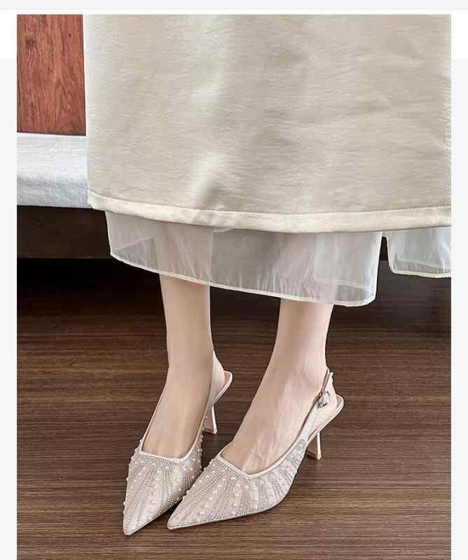 ミュール レディース ポインテッドトゥ ラインストーン ピンヒール エレガント フォーマル オフィス 通勤 デート サンダル 合成皮革 ミドルヒール アプリコット ピンク