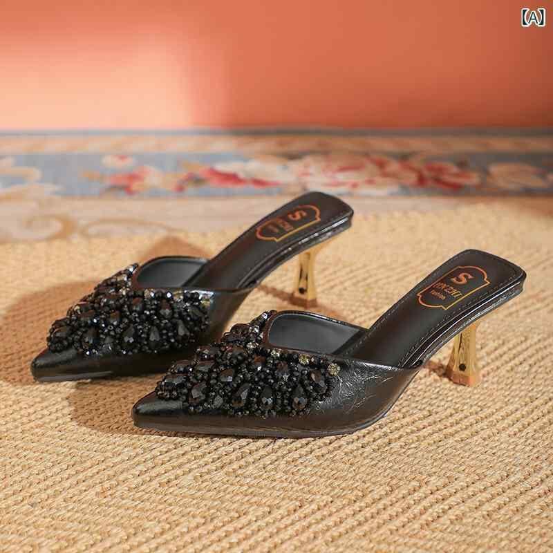 ミュール レディース ラインストーン フレンチスタイル 高級感 エレガント ハイヒール ポインテッドトゥ 大きいサイズ 合成皮革 ブラック ブラウン 韓国風 オフィス カジュアル パーティー