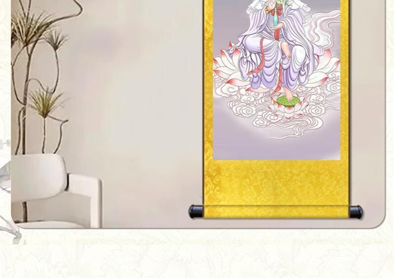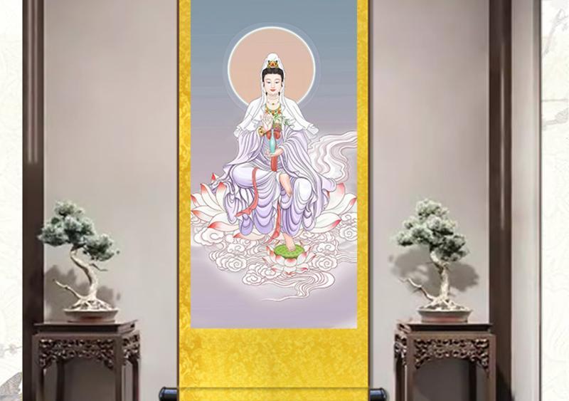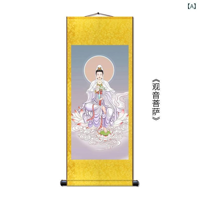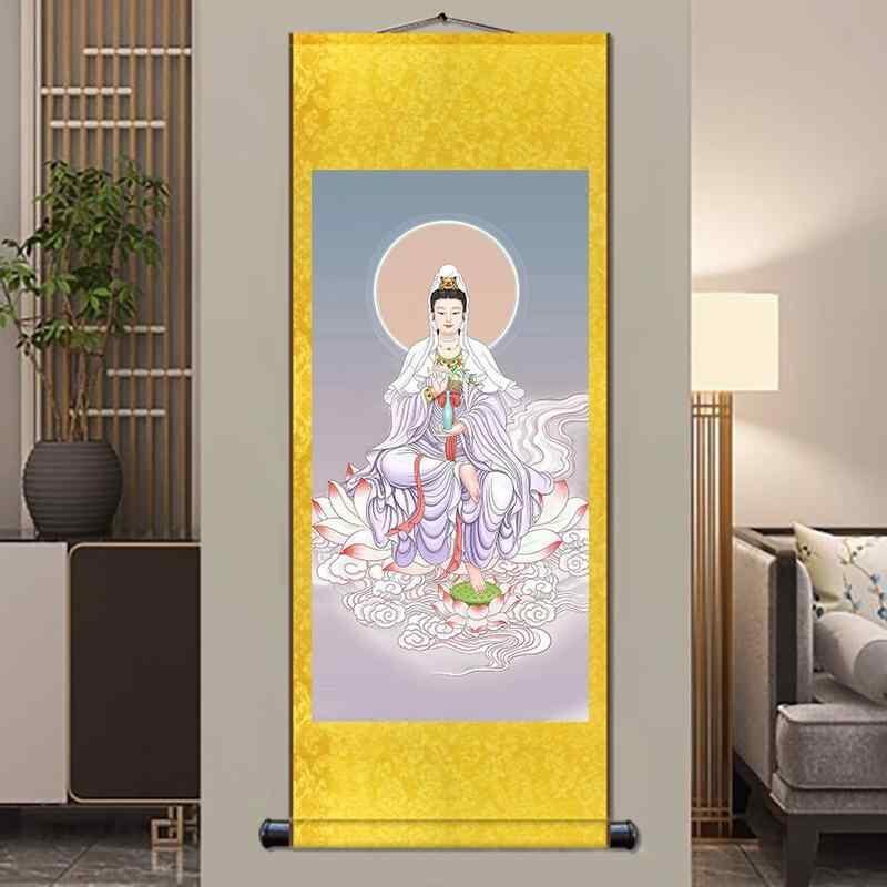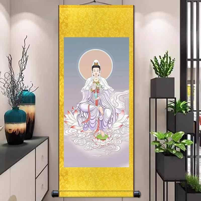 掛け軸 観音菩薩像 仏画 宗教画 中国画 水墨画 複製画 絹本 シルク ウォールデコレーション 装飾 インテリア リビング 玄関 書斎 寝室 和室 床の間