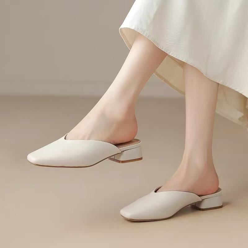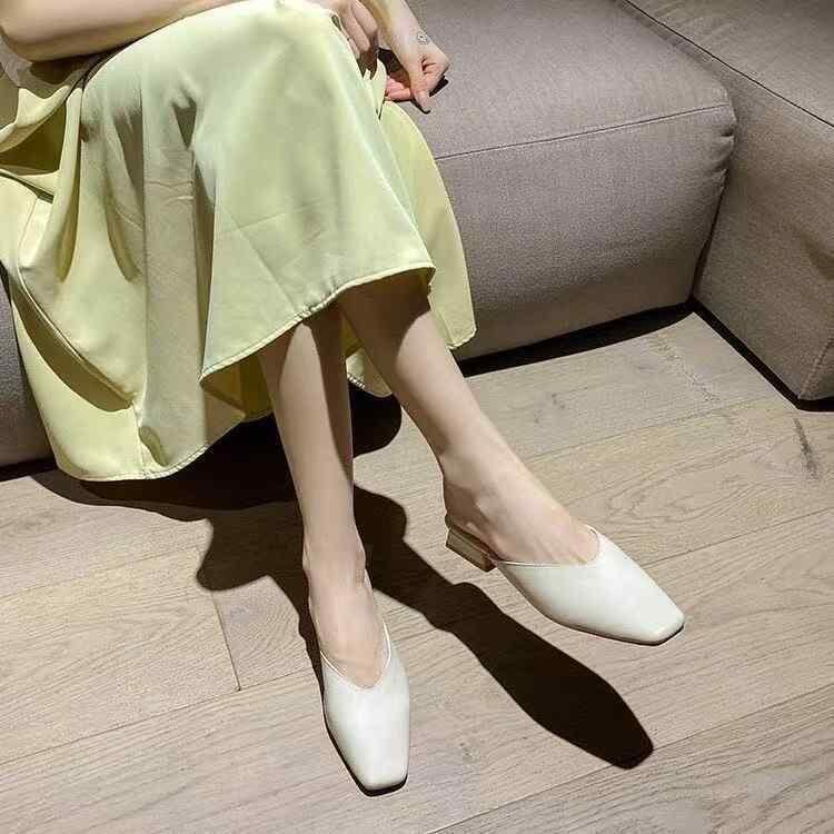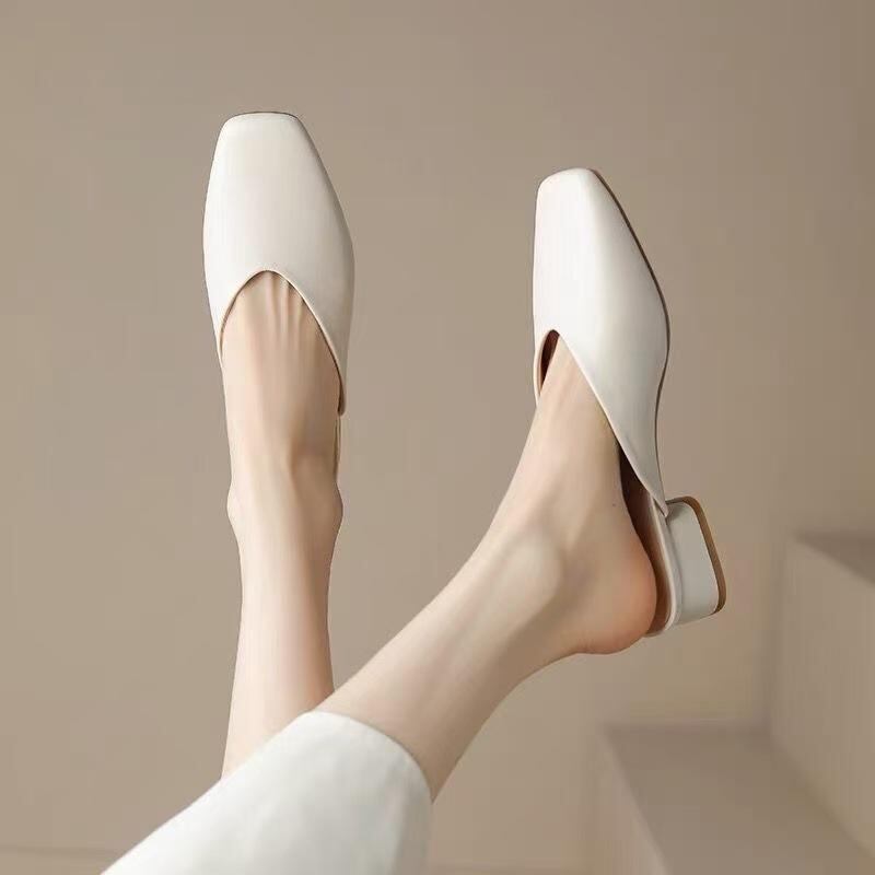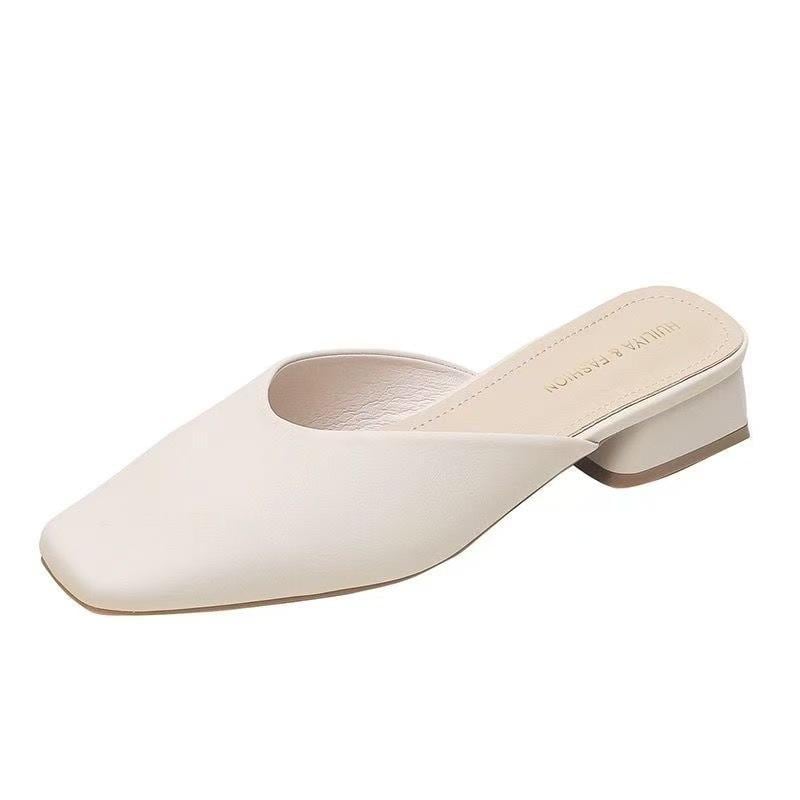 ミュール サンダル レディース つま先カバー スクエアトゥ 太ヒール ミドルヒール フェイクレザー 合皮 バックレスシューズ 高級感 韓国ファッション オフホワイト アイボリー 普段使い お出かけ オフィス カジュアル