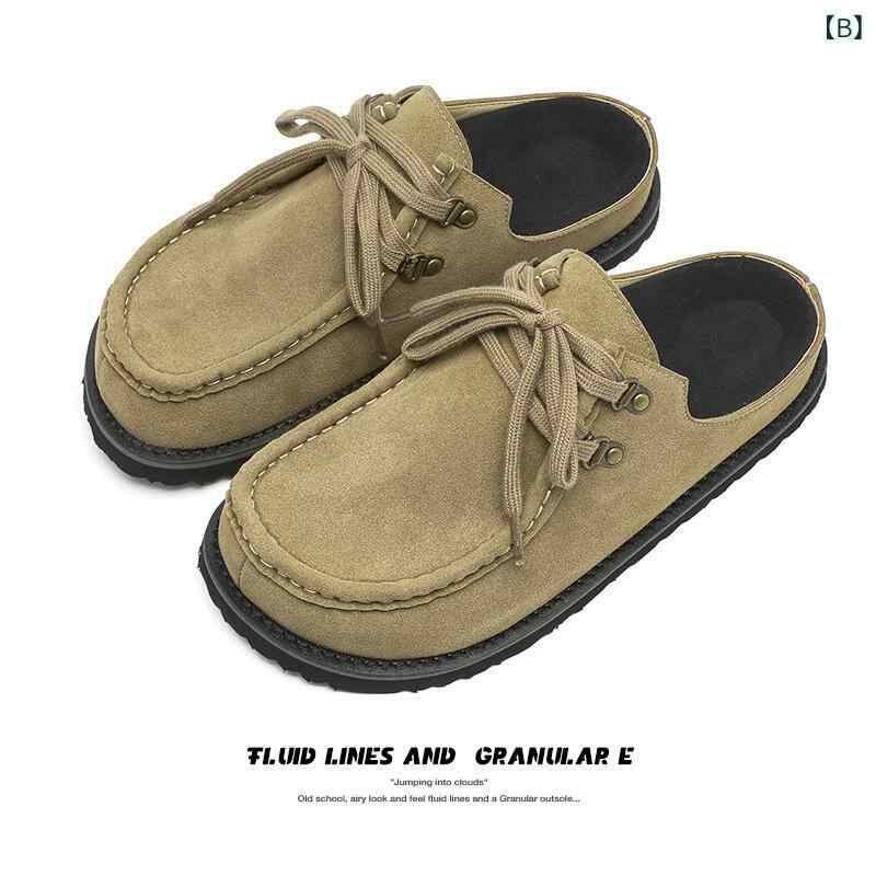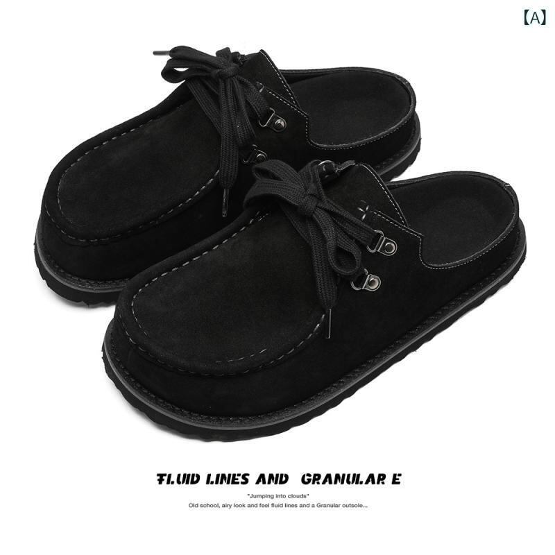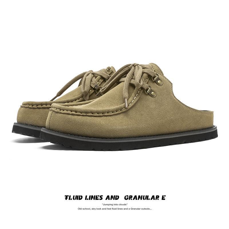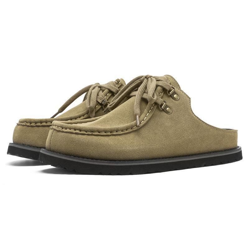 サンダル 男女兼用 牛革スエード スクエアトゥ クローズトゥ ミュール レースアップ 高級感 トラッドスタイル カジュアルシューズ ゴムソール つま先保護 普段使い