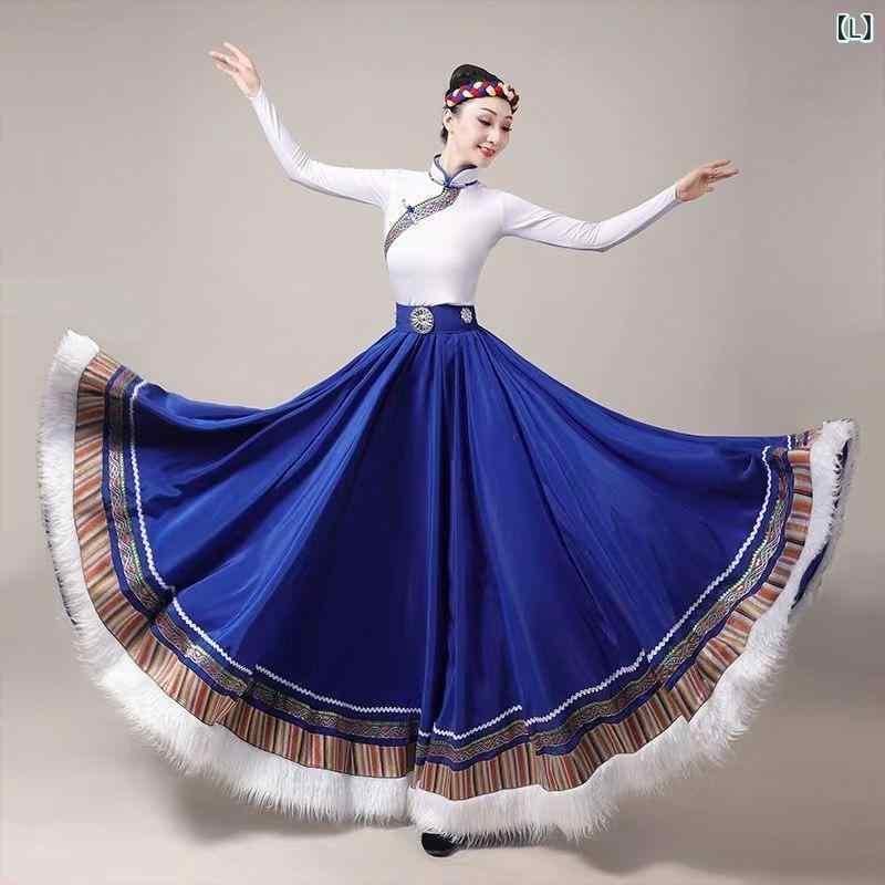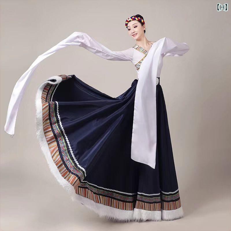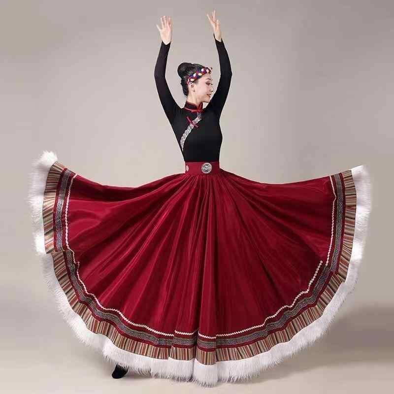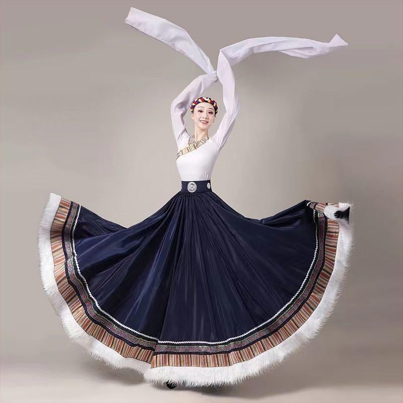 チベット民族衣装 レディース ダンス 舞踊 舞台衣装 水袖トップス フレア ロングスカート ボリューム 練習着 発表会 学生向け 演劇 芸術実技試験用 ポリエステル素材