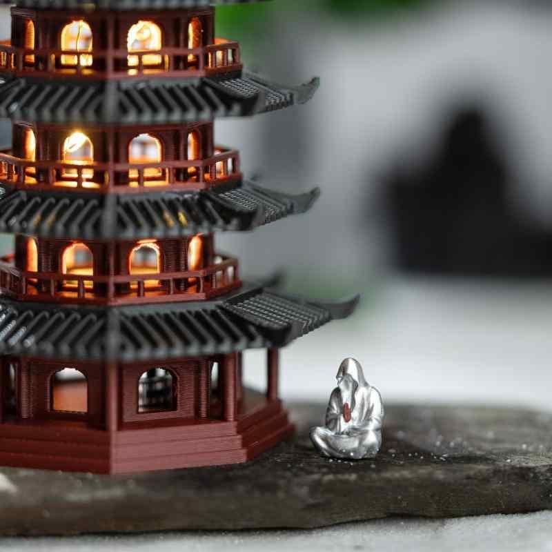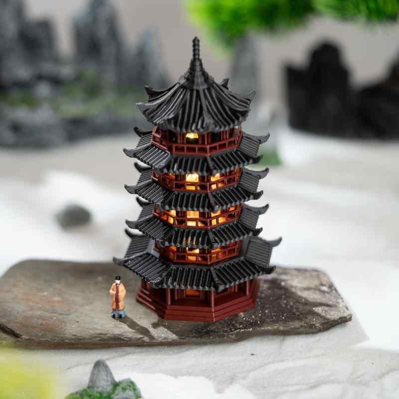 ジオラマ ライト付き 精巧 宝塔 オブジェ ミニチュア風景 ミニチュア山 盆栽 吸水石 青龍石 東屋 置物 古風 和風 レトロ アンティーク調 室内装飾 庭園デコレーション リビング書斎用 PLAプラスチック製 癒し 風水 開運アイテム