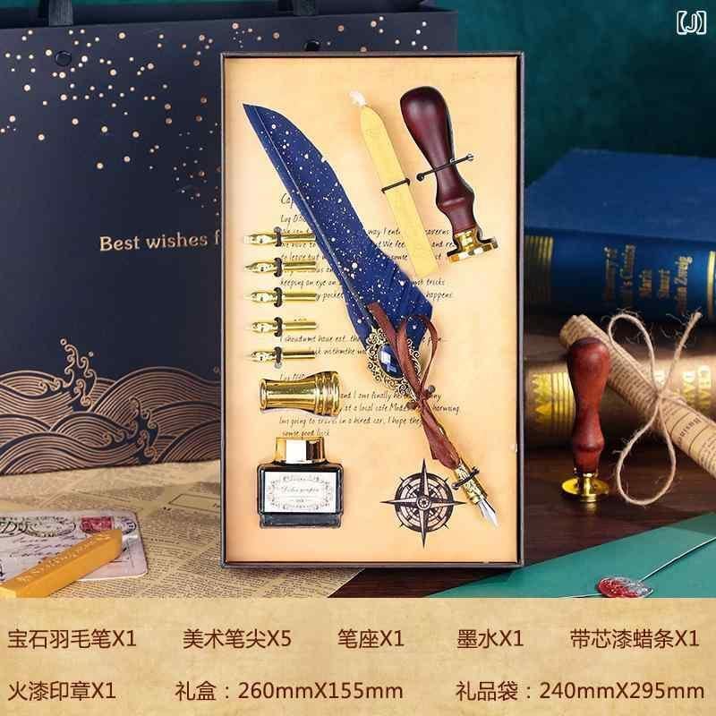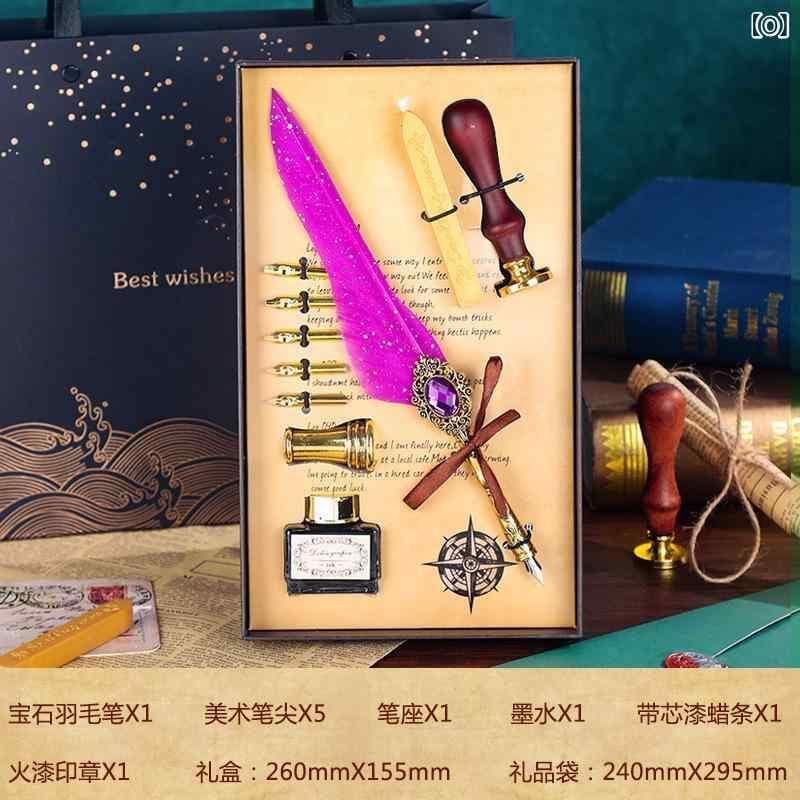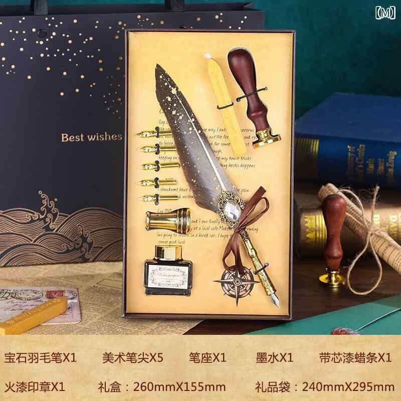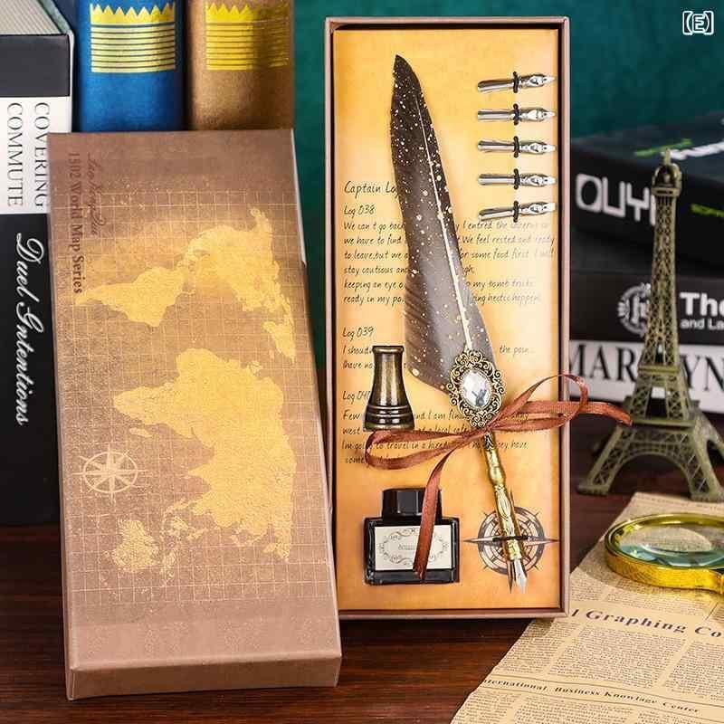 つけペン 羽ペン ヨーロピアン レトロ アンティーク調 クラシック ゴールド装飾 金属製ペン先 学生向け 学業用 誕生日 プレゼント ギフトボックス入り 書斎用 筆記具 高級感