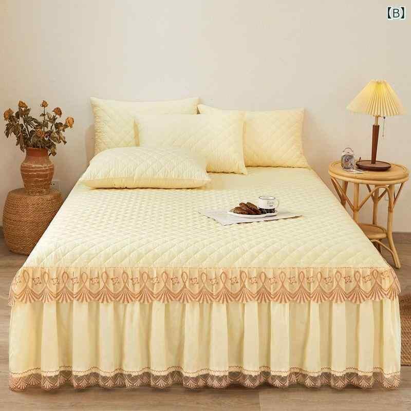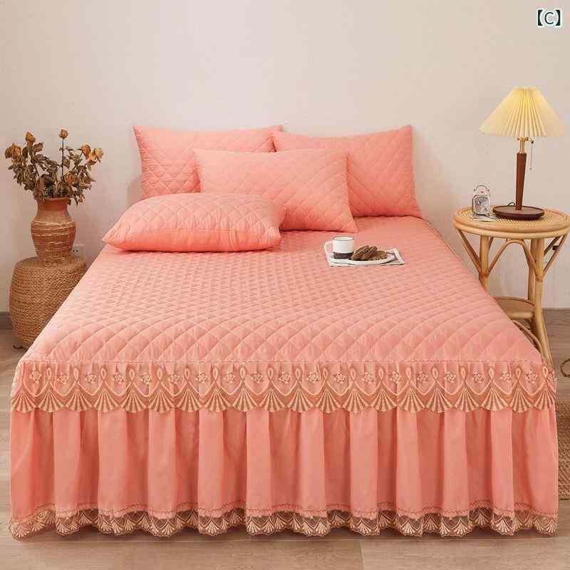 ベッドカバー 3点セット キルティング 厚手 滑り止め レース ベッドスカート 竹繊維 裸寝対応 肌触り快適 吸湿速乾 通気性 宮廷風 北欧風 寝具 シーツ グレー ベージュ ピンク ブルー