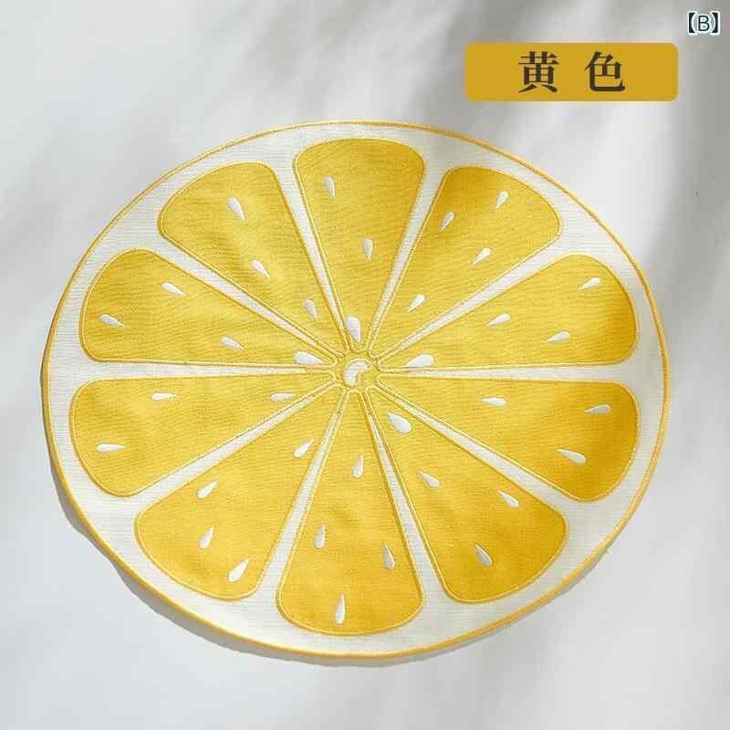 ランチョンマット 高級感 レモン刺繍 丸形 リネン 麻製 二重仕立て ツートンカラー 家庭用 食卓マット ティーマット デスクマット ナチュラル テイスト 田園風 おしゃれ かわいい ブラウン イエロー オレンジ グリーン 直径38cm